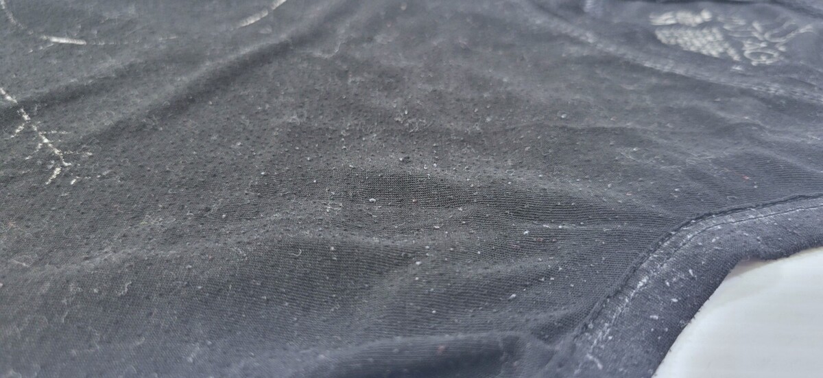 Shirt is in used condition. It has a factory distressed look along with some fading and fabric piling due to use, wear and wash.