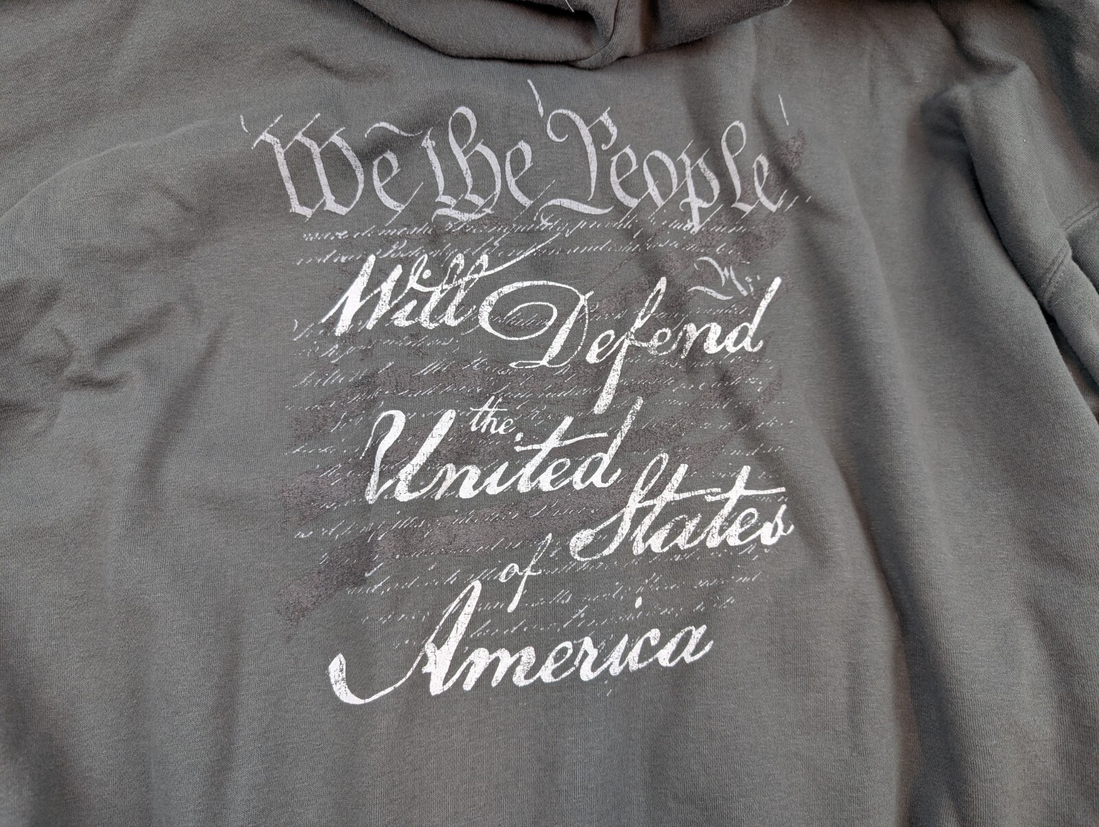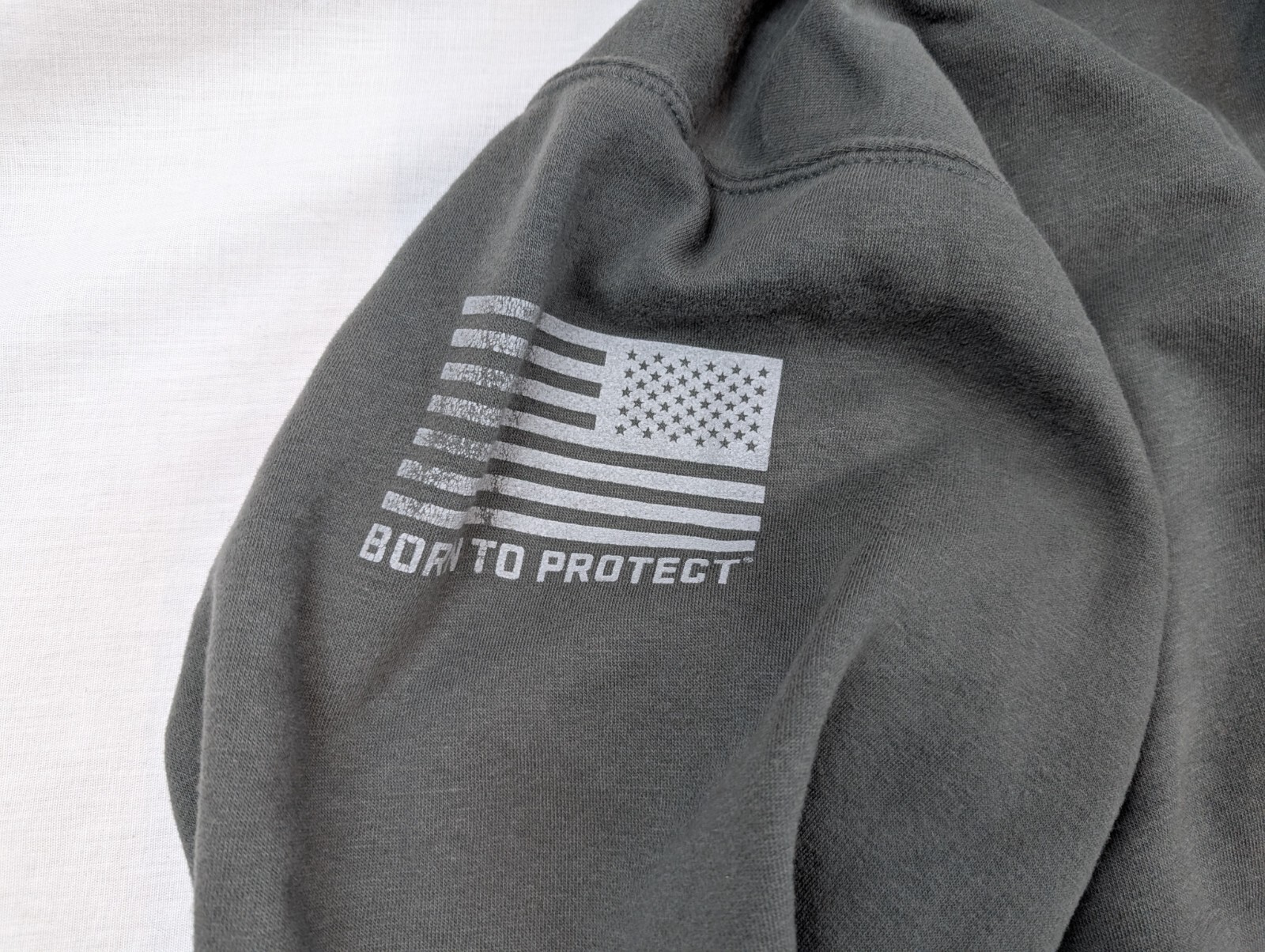 USCCA on the front, Born to Protect on the sleeve and "we the people" graphic on the back.