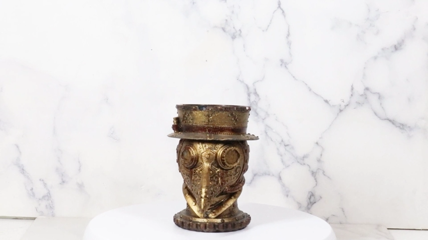 ? This Steampunk Plague Doctor Ashtray And Box Sculpture is made of designer composite resin, hand painted and polished individually. All gears and clockwords are sculpted and painted onto the sculpture. They do not move.