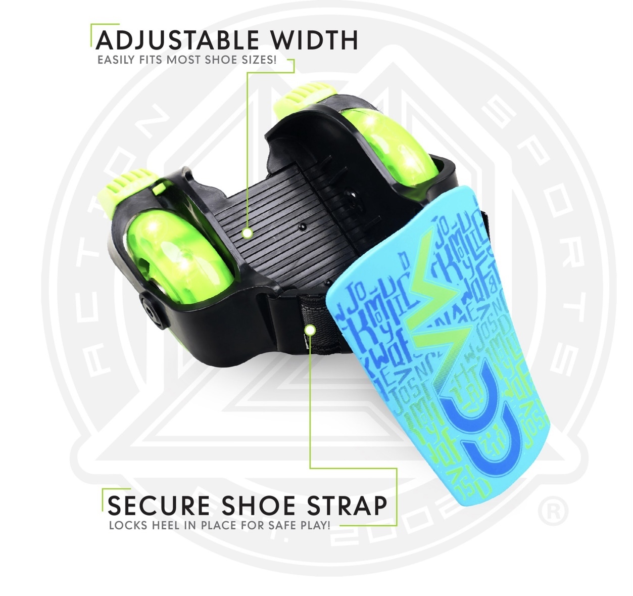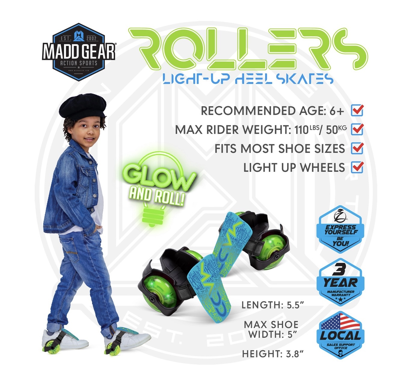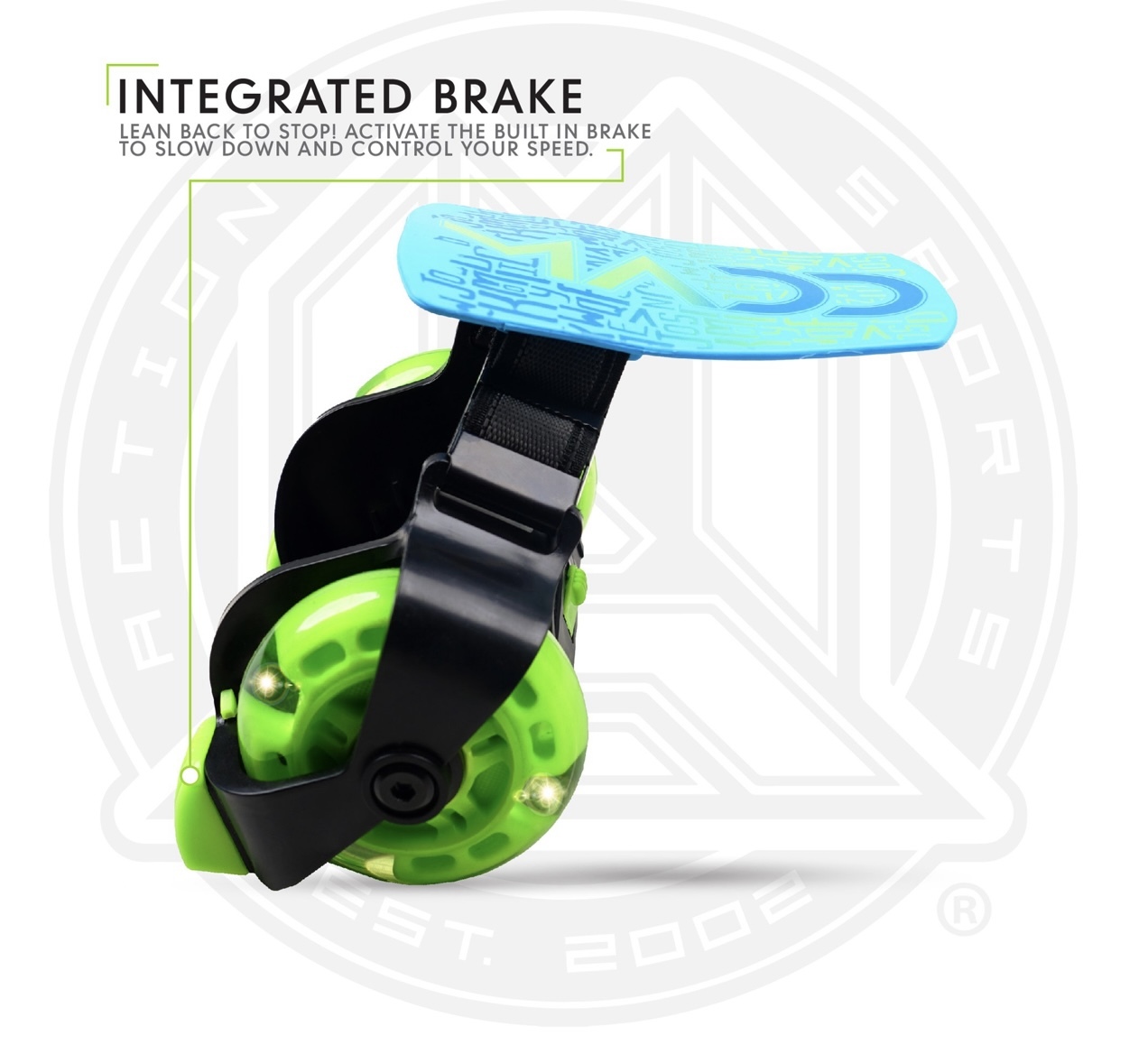 The Madd Light-Up Rollers are ready to turn your ordinary shoes into awesome roller skates in seconds! Fully adjustable to fit most shoe sizes yet less bulky than regular roller skates, the Madd Rollers can turn any situation into the most amazing adventures! Blaze a trail and light-up your path with the innovative motion activated LED light wheels that omit an awesome glow as you roll! Safe and secure, the Madd Rollers are fixed securely in place with a rubber shoe strap and feature a safety brake for stopping quickly.