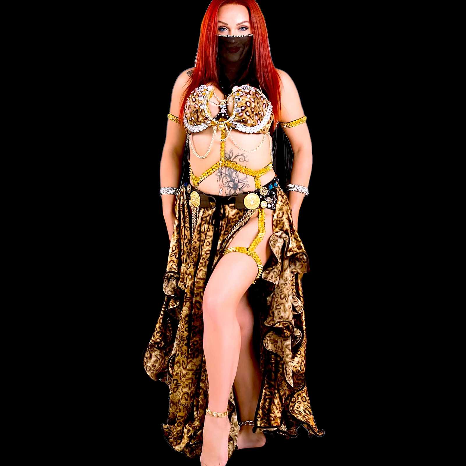 - Made-to-Order Leopard Print Belly Dance Costume: Crystal Bra, Belt & Skirt