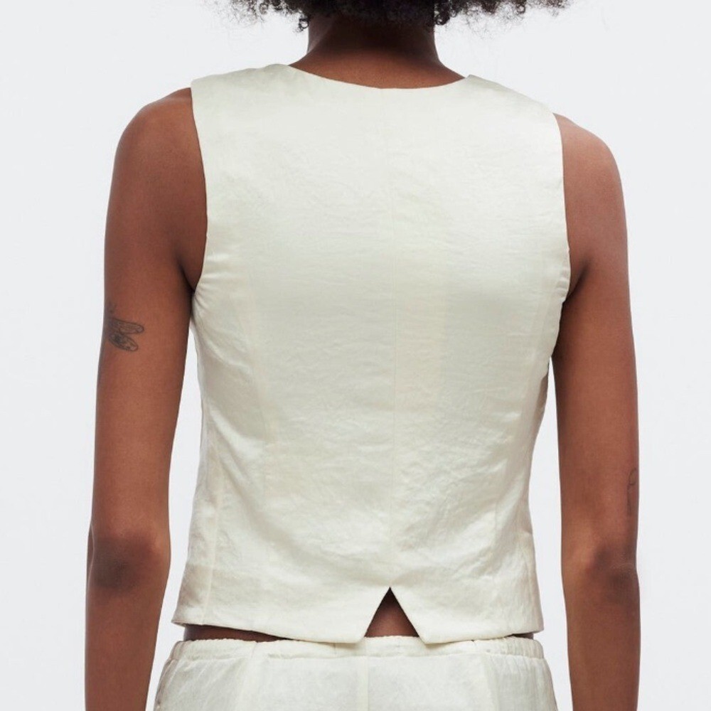 A minimalist's dream, this neutral vest is crafted of recycled drapey satin. Sleek and chic, it features concealed buttons down the front.