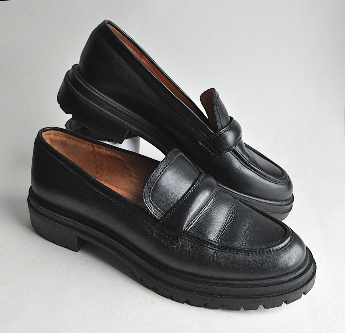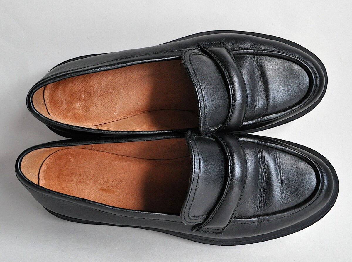 Pair of Madewell "The Bradley" lugsole black leather loafers. Classic preppy loafer updated with a puffy keeper and rugged extra-chunky lugsoles. Smooth black leather with leather lining and insole, partially recycled rubber sole, and comfy MWL Cloudlift Lite cushioning. 1 3/4" heel; sole is 7/8" under the ball of the foot. Women's size 9, regular width; product reviews on Madewell indicate these run slightly big.