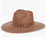 Totally fashionable and functional, this straw fedora has a wide brim and a studded leather band.