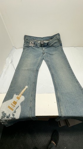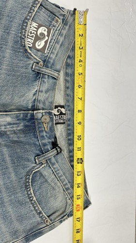 The Maestro woman's jeans in size 15 31? length feature a stylish graphic design on the leg, adding a unique touch to the classic blue flared style. Designed for regular fit, these jeans are ideal for women looking for a trendy and comfortable wardrobe staple. Perfect for casual or dressed-up looks, these jeans from Maestro Clothing Company are a versatile and fashionable choice for any woman's wardrobe.