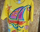 The Magic Memories Medium Size Ladies Hand Painted T-shirt features a charming sailboat pattern, perfect for casual or travel occasions. Made from poly cotton knit fabric, this vintage-style shirt has a round neck and short sleeves for a comfortable fit. Hand-painted with vibrant multicolor hues, this T-shirt is machine washable and ideal for the summer, fall, and spring seasons. Proudly made in the United States, this unique piece from the Magic Memories brand is a must-have for any woman looking to add a touch of handmade flair to their wardrobe. 38" chest and 25" length