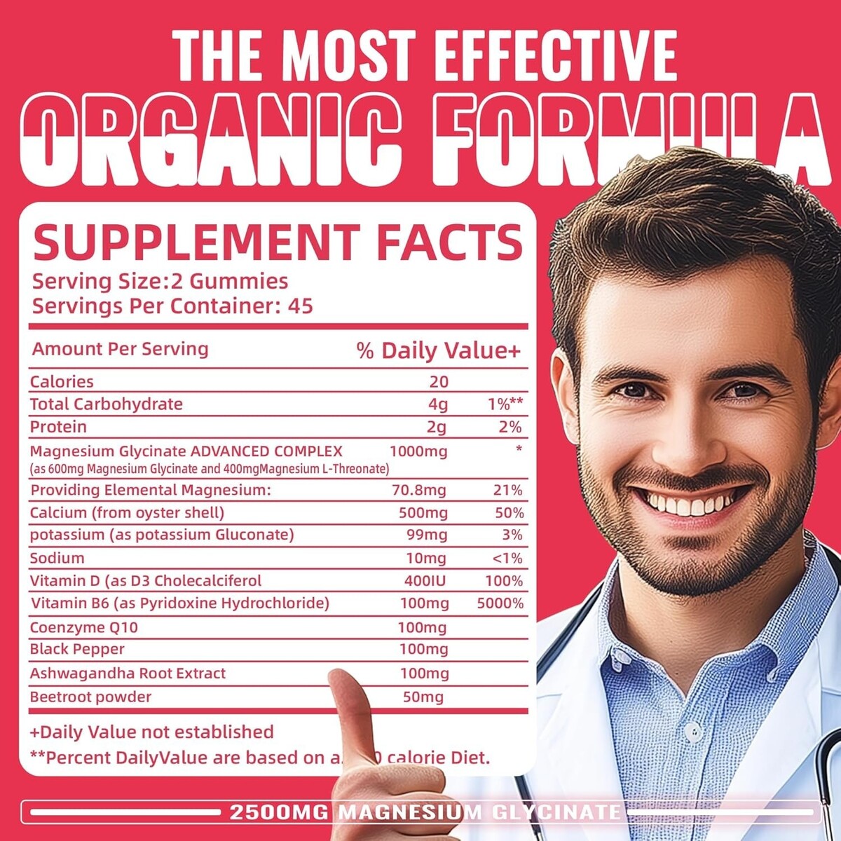 Our Magnesium Gummies Contain Magnesium Glycinate 2500mg, , Vitamins D, B6, Calcium, Potassium, etc. Added Vitamin B6 help magnesium work better, Coenzyme Q10 and potassium help support the mind system and improve Memory and inattention, Vitamin D promotes the absorption of calcium
