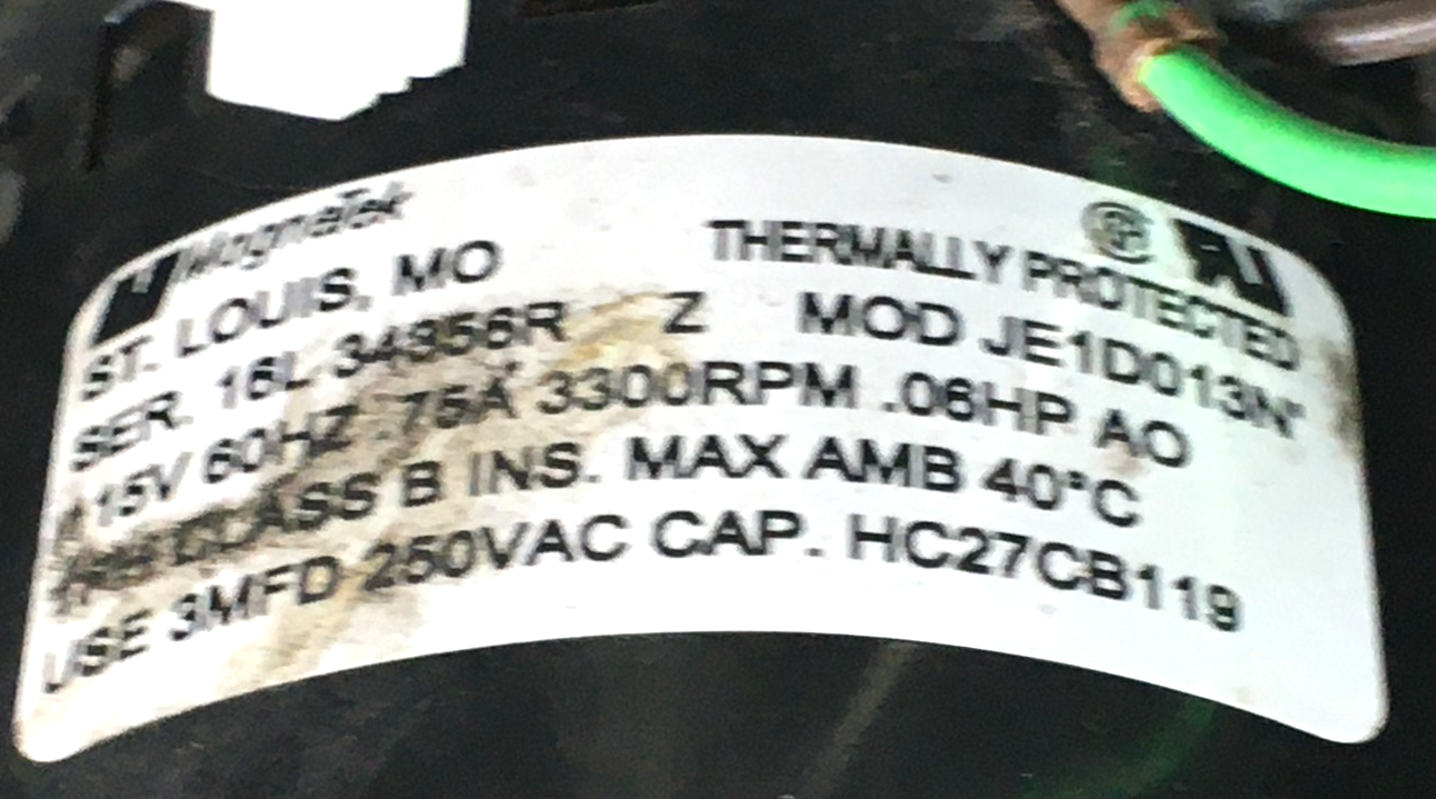 This is Magnetek JE1D013N Carrier Bryant Draft Inducer Blower Motor HC27CB119 115V 3300 RPM .06HP used part.