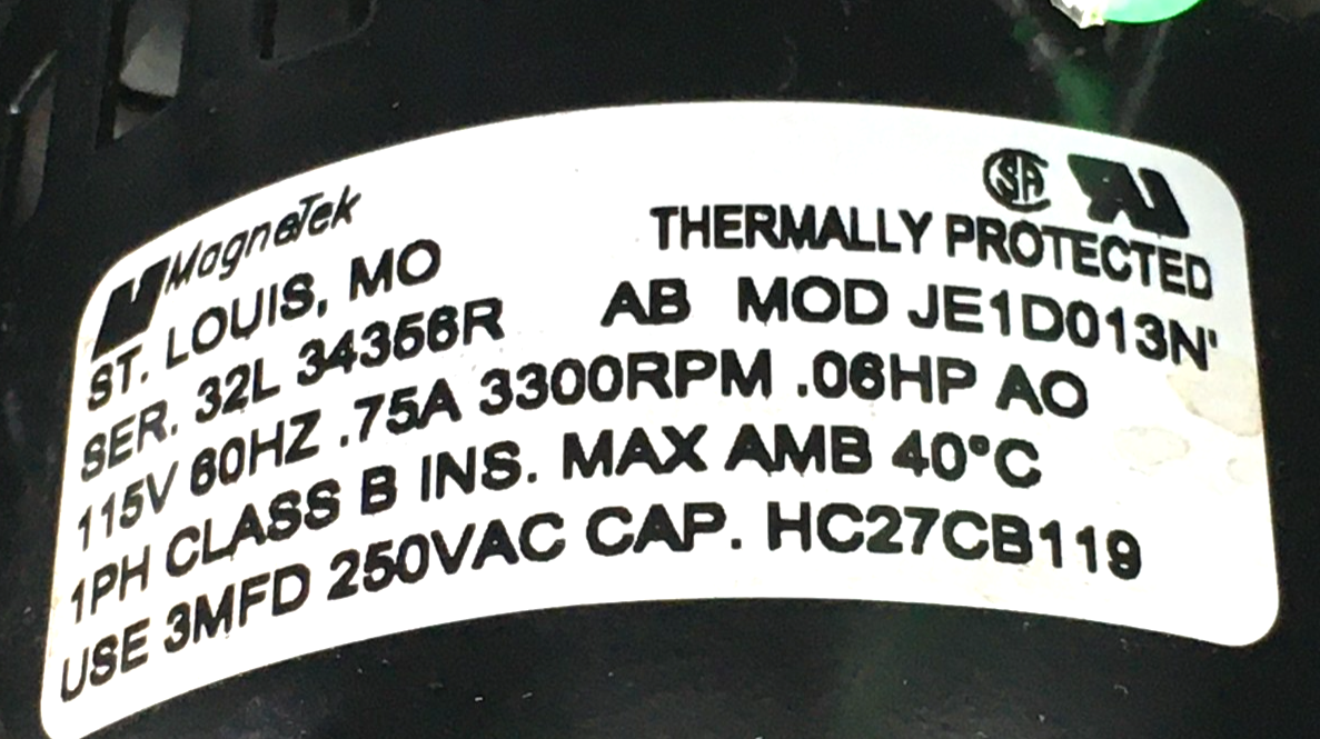 This is Magnetek JE1D013N Carrier Bryant Draft Inducer Blower Motor HC27CB119 115V 3300 RPM .06HP used part.