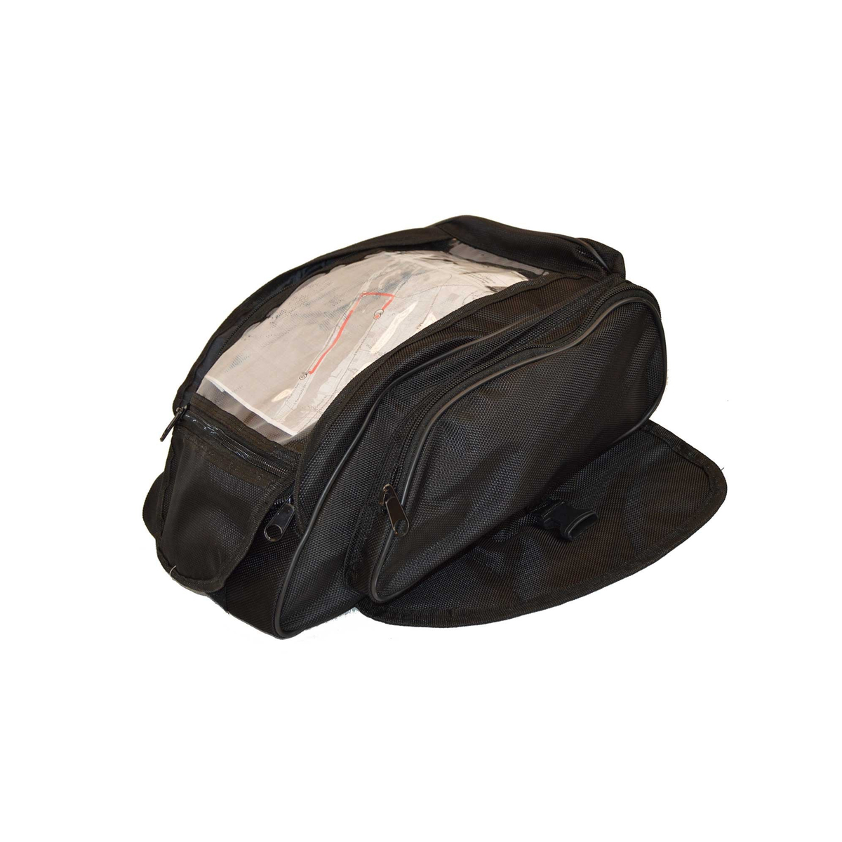 7 inch X 10 Inch clear map pocket 2 Full length spacious side pockets Carry Handle and shoulder strap for use when removed from bike Heavy duty magnets and additional strap to secure to tank Overall length 13 inches Overall width 12 inches Overall height 6 inches Rain cover