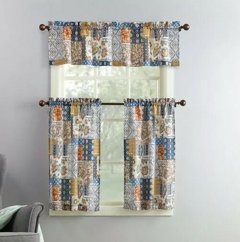 - Mainstays ~ Amelia ~ Patchwork ~ Semi-Sheer ~ 3 Pc. Tier & Valance Set ~ Navy