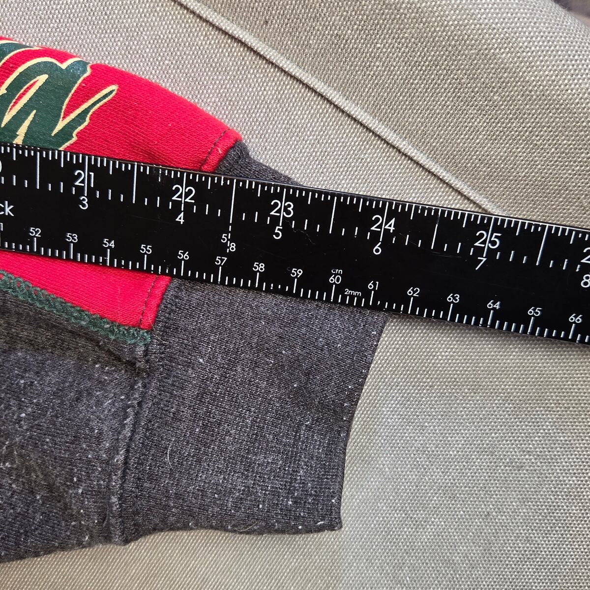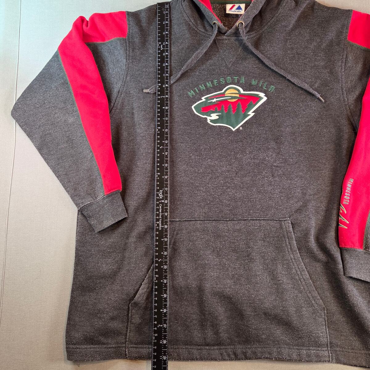 Majestic Minnesota Wild hoodie featuring team logo on the chest and sleeve script detailing. Classic gray and red colorway with a 2009-dated logo graphic. The original size tag is missing, but based on measurements it fits like a Men?s XL (see below for exact sizing). Overall good condition with no noticeable flaws.