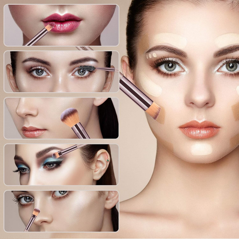 Includes 5pcs big face makeup brushes and 10pcs detail and eye brushes for applying foundation, blending eyeshadow, concealer, blush, powder, or contouring.