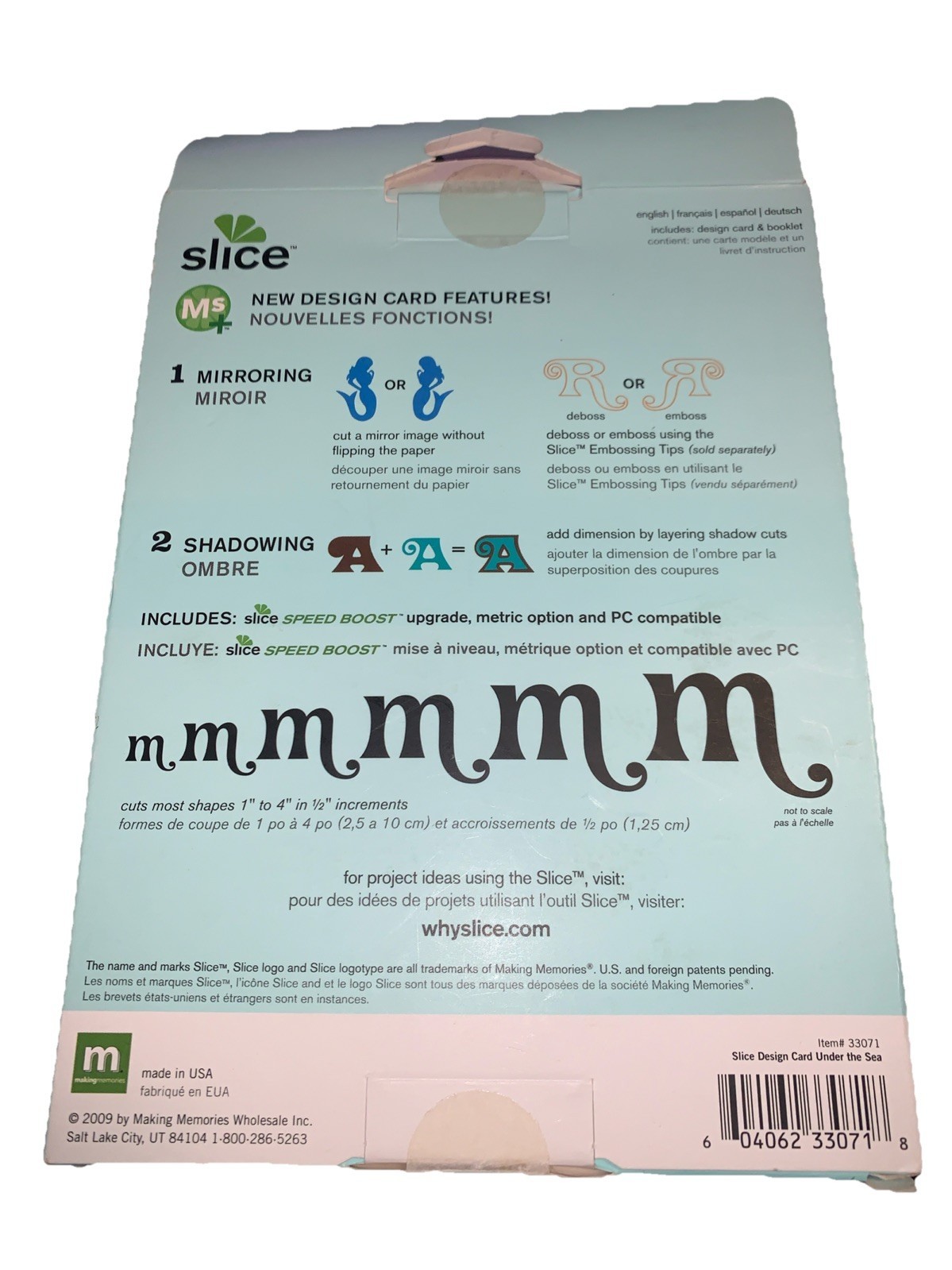 The "Under The Sea" slice cartridge by Making Memories is designed for creating unique and detailed die-cut designs for scrapbooking and paper crafts. With a focus on ocean themes, this cartridge offers a variety of shapes and patterns to enhance your projects. Whether you're looking to add sea creatures, waves, or other underwater elements to your creations, this cartridge provides a wide range of design options to help you make memorable pieces.