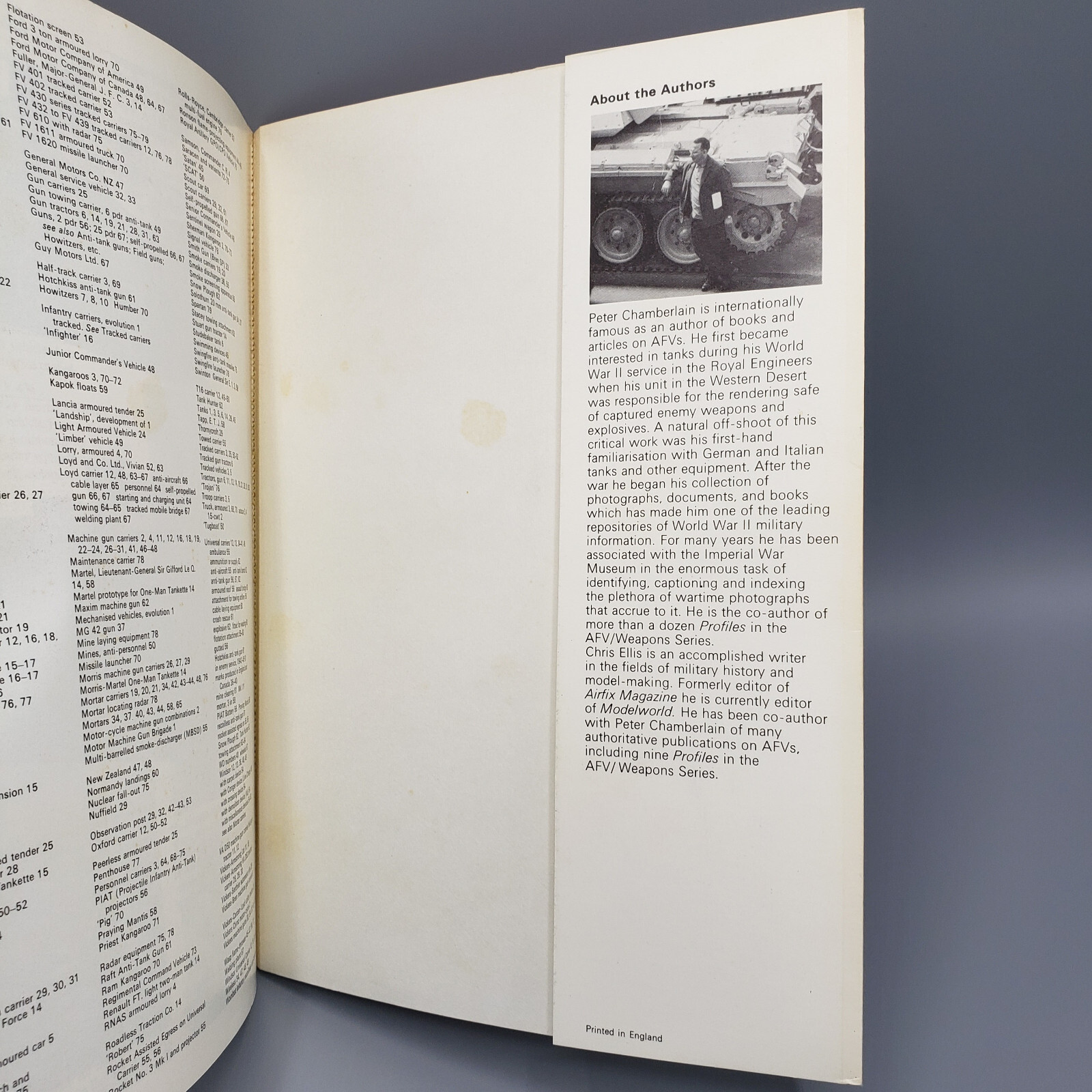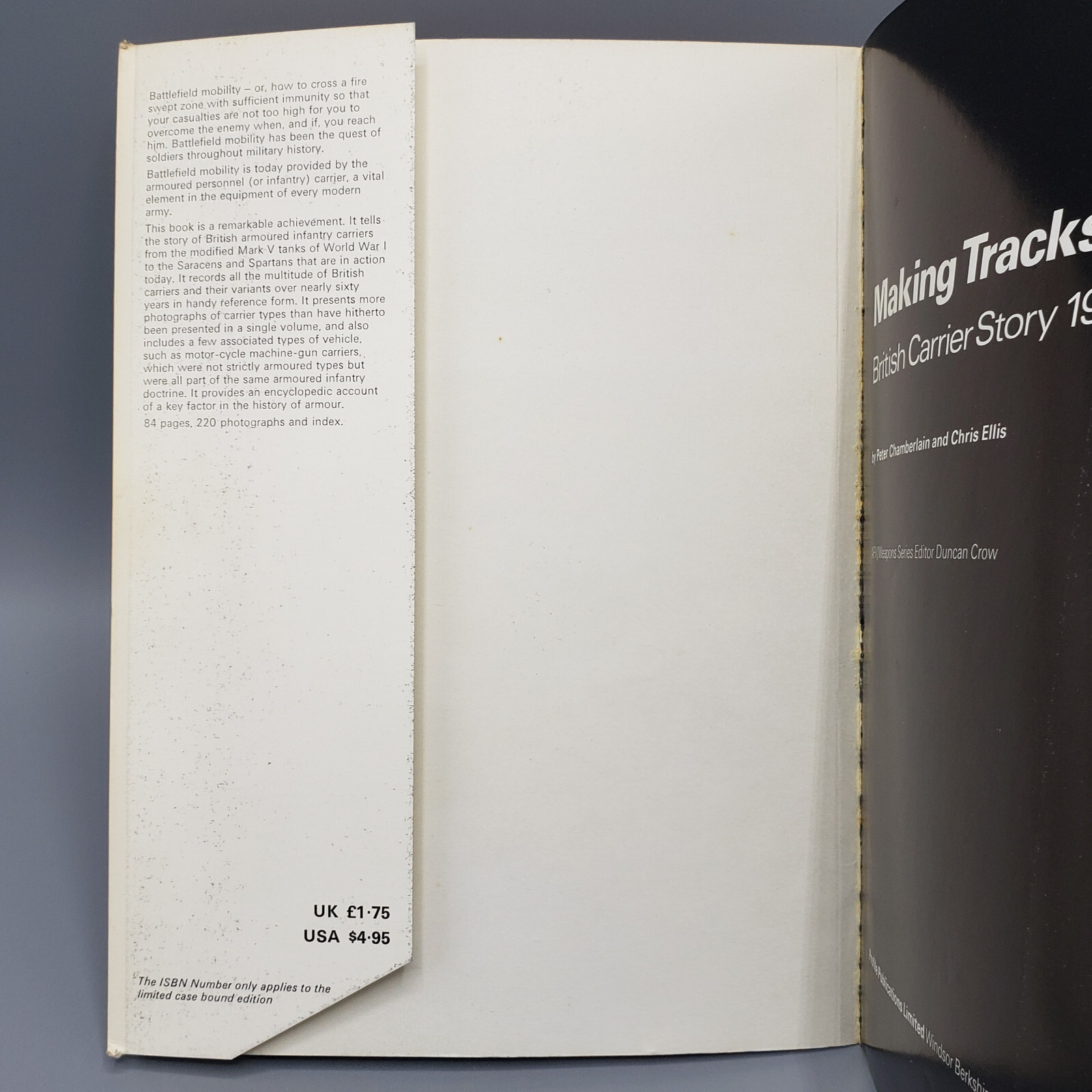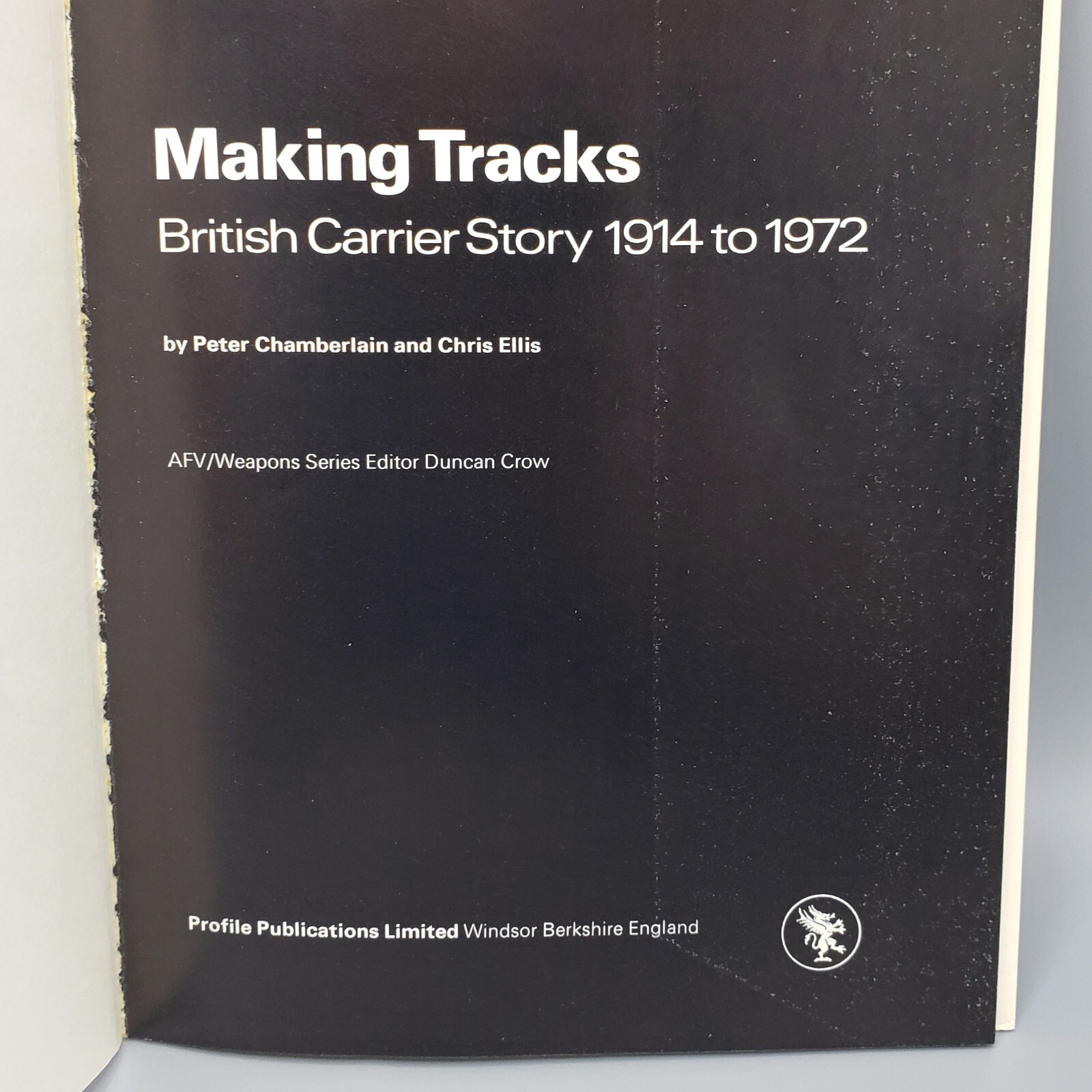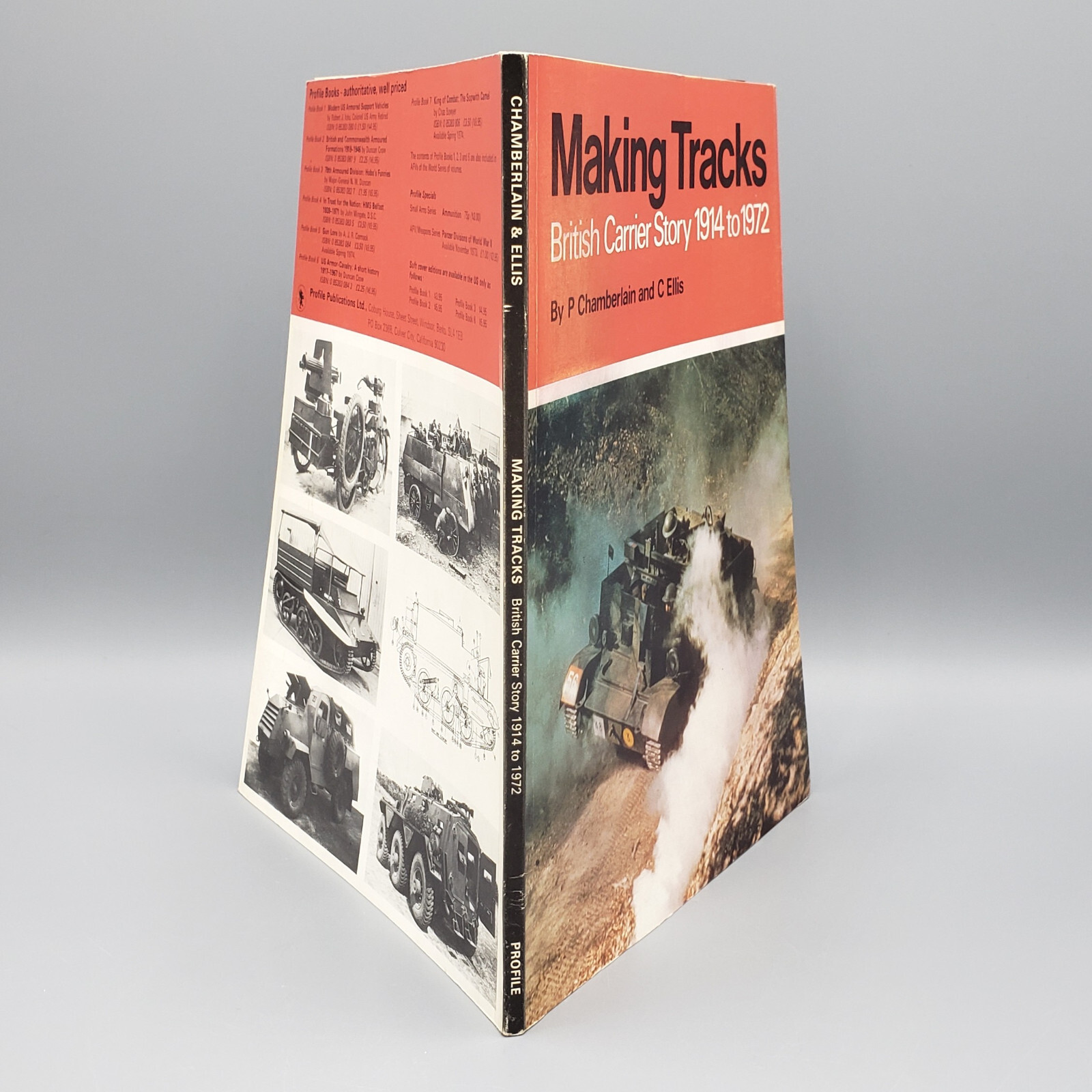 Making Tracks: British Carrier Story 1914-1972 by Peter Chamberlain and Chris Ellis. This vintage trade paperback book was published in 1973 by Profile Publications Limited. It was printed in England and measures approximately 9-7/8" tall, 7-3/8" wide, 3/8" thick.