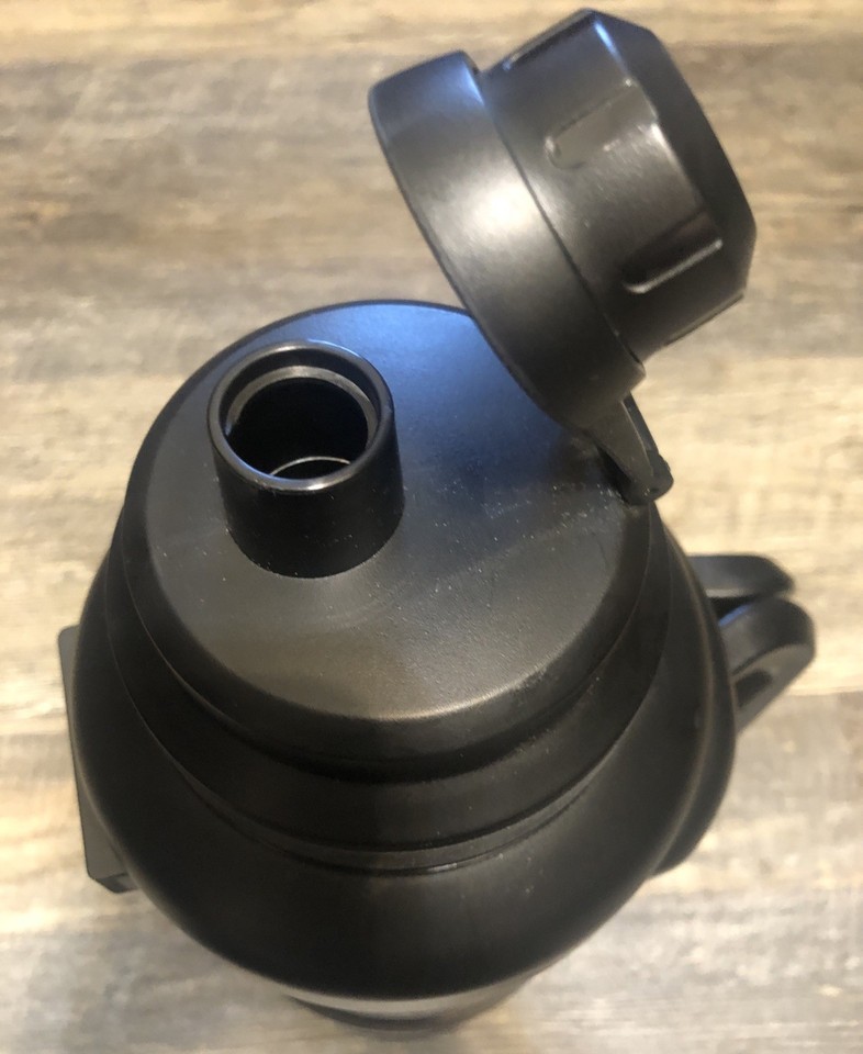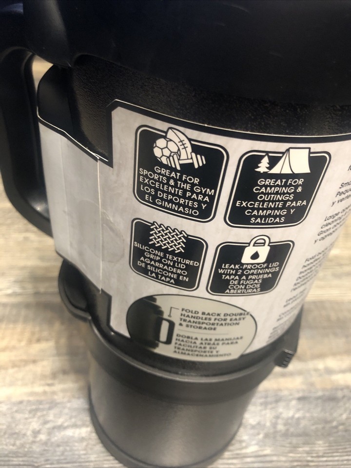 It features a leak-proof lid with two openings for drinking/pouring and for adding ice/cleaning.