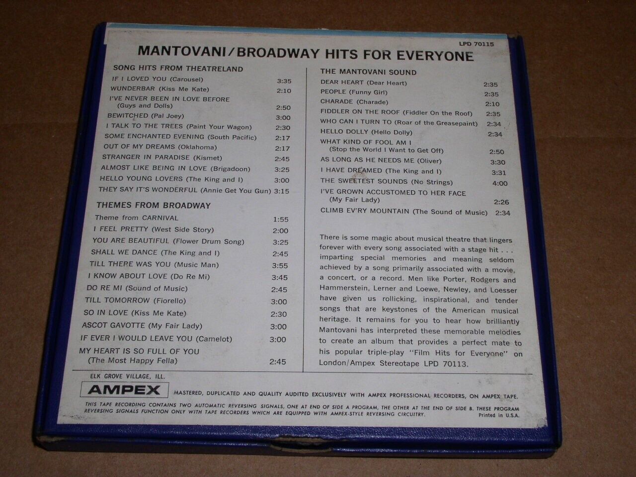 This is an original, vintage pre-recorded reel to reel tape by Mantovani, entitled, "Broadway hits For Everyone". Recorded at 3 3/4 IPS. London label LPD 70115.