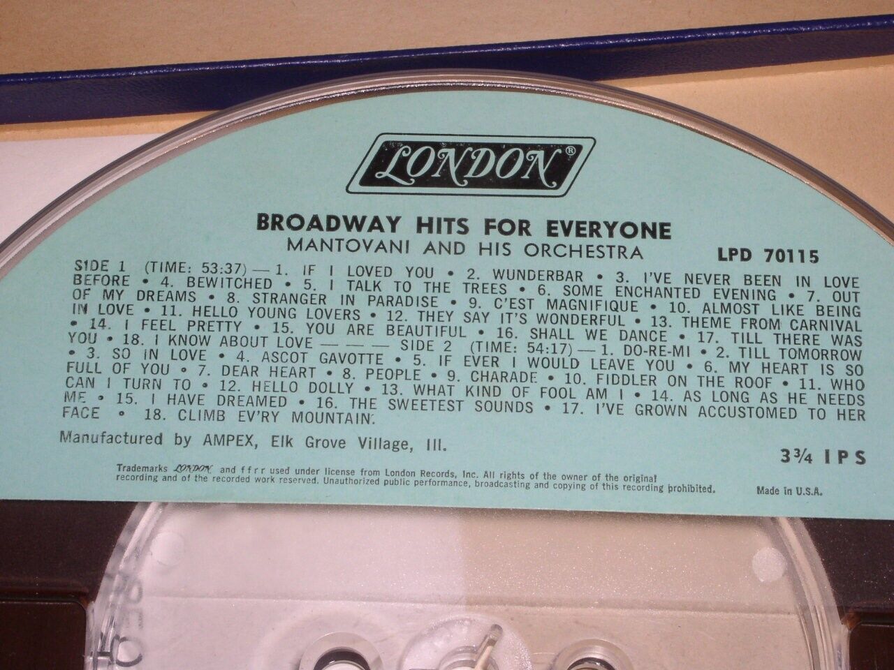 - Mantovani Reel To Reel Tape Broadway Hits Vintage London Label 3 3/4 IPS