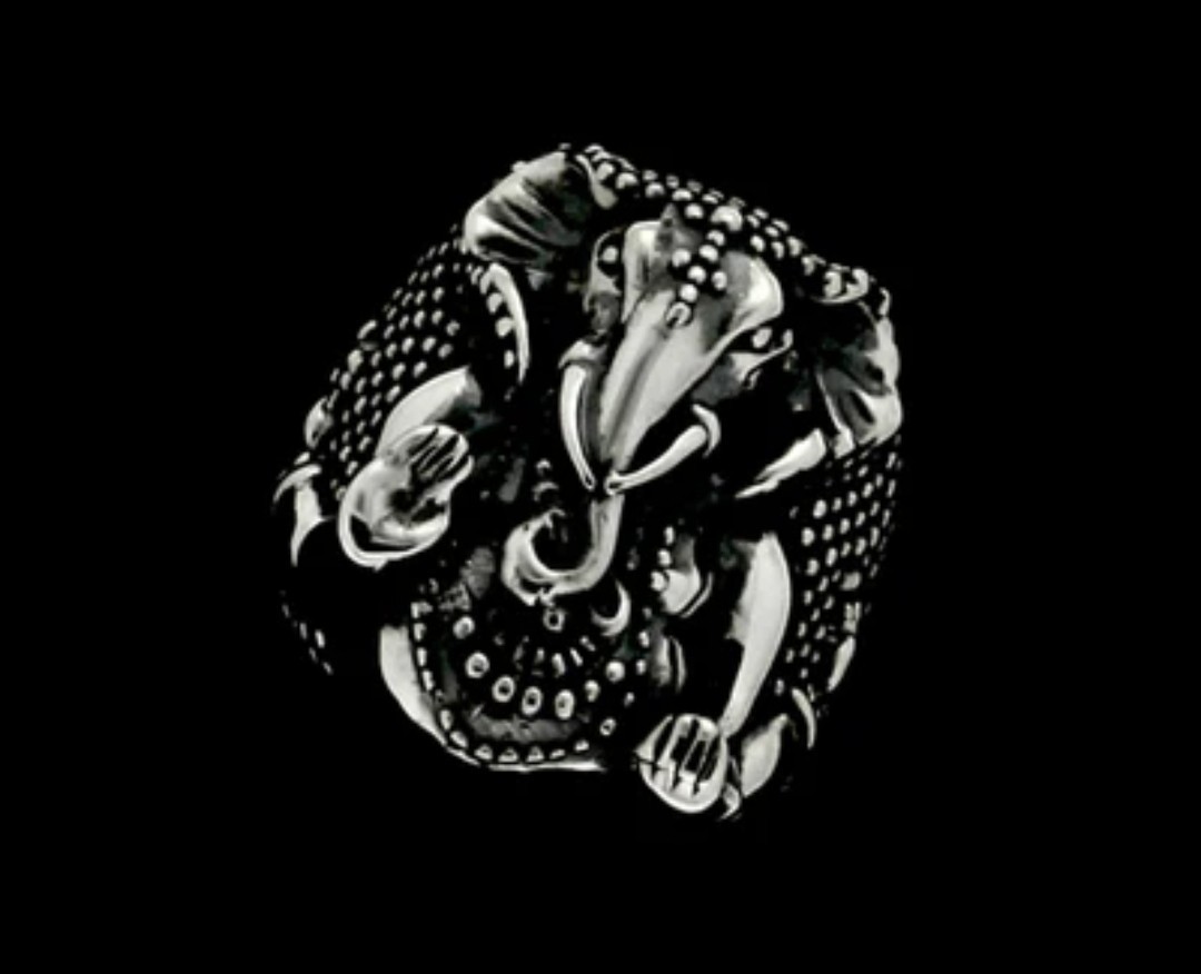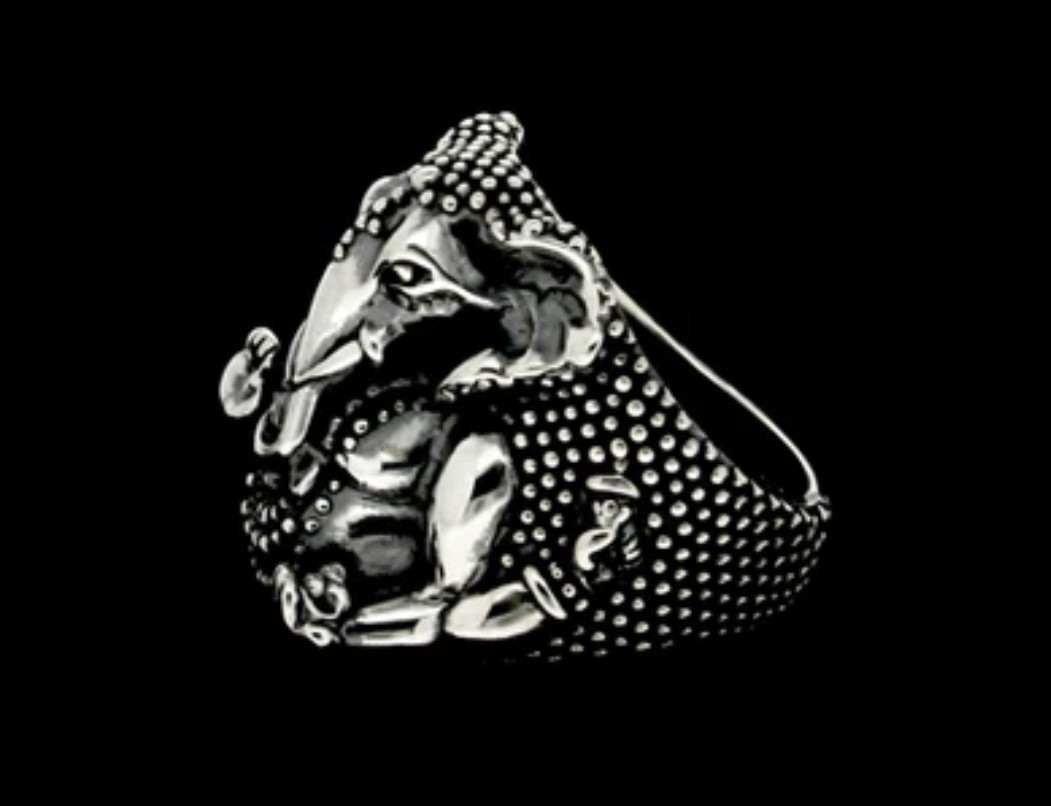 Manuel Bozzi pays tribute to Ganesh with this burnished and polished 925 Sterling Silver ring. Richly detailed and with a pallinated finish, it is a microsculpture to wear on the finger.
