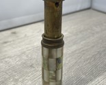 Preowned, very good condition for age some marks and scratches but minimal. Untested Checkerboard Mother of Pearl pattern. The bottle has gold tone metal and is marked on the outside Le Kid France, and still easy to read. To open the bottle place your finger on the top and turn counterclockwise quarter turn to close press the plunger back down and turn it, clockwise to lock it in place