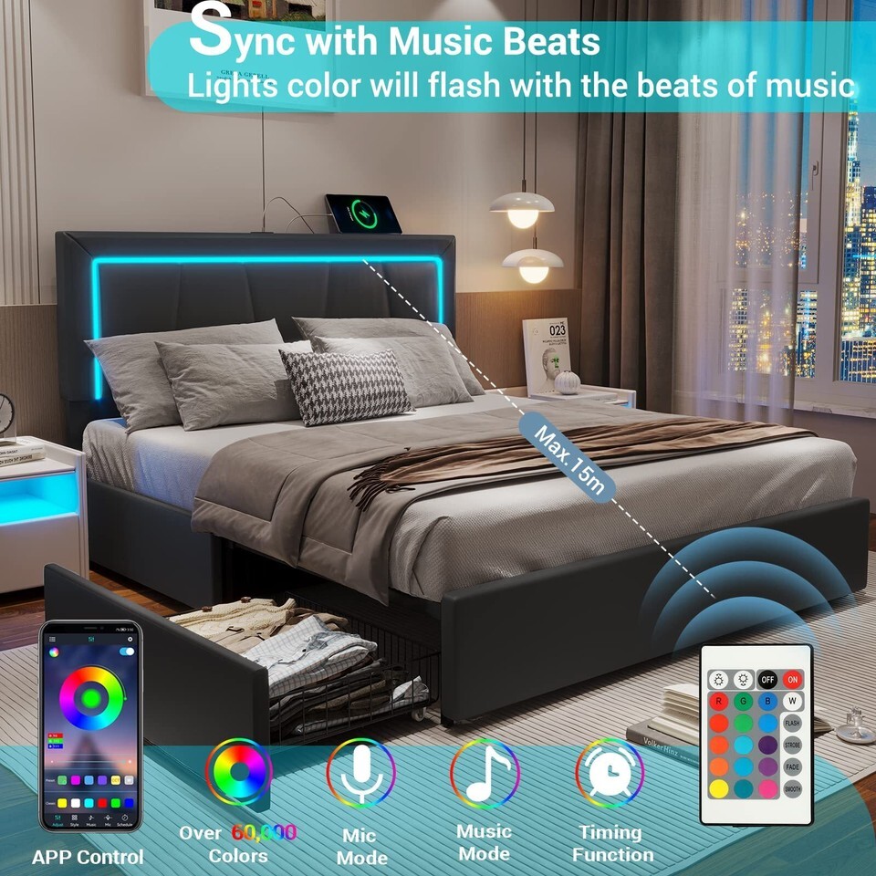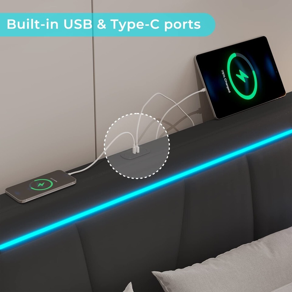 UNIQUE LED HEADBOARD AND USB PORT - The upholstered headboard is equipped with three-side hidden light strips, The LED light with a variety of colors and light patterns to choose from, It can meet simple lighting needs, but also can create a romantic bedroom atmosphere. 2 USB Ports on each side of the headboard, which convenient for you to charge your phone and tablet lying in bed.