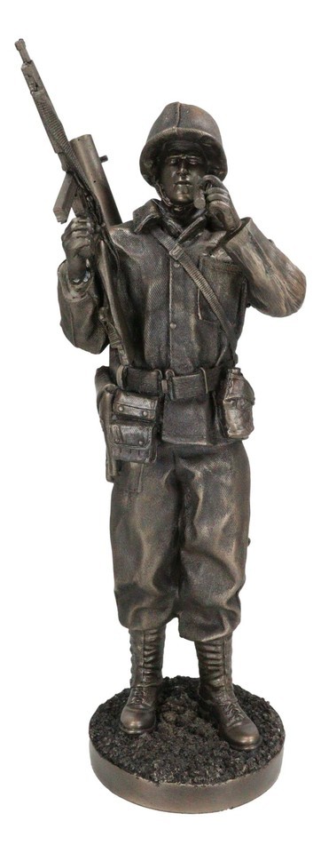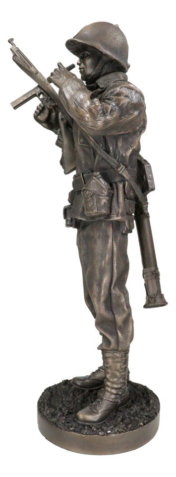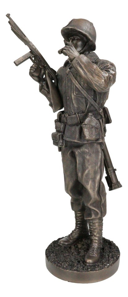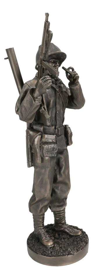 ? This figurine is a detailed replica of a World War Combat Sergeant at rest in a station. He stands at the commanding post and gazes across the war torn terrain smoking a cigar. He carries a bazooka on his back and a rifle on his right arm.