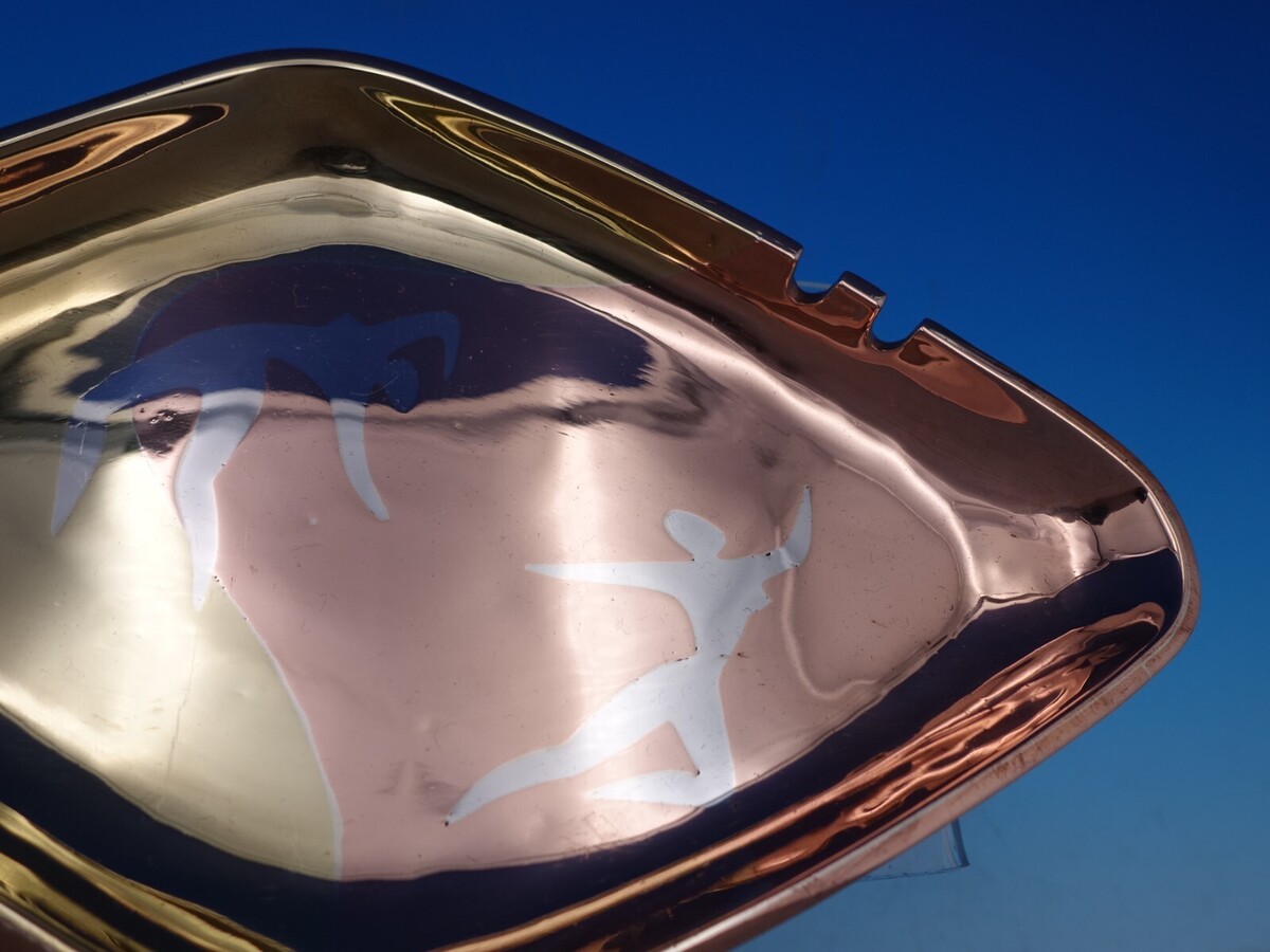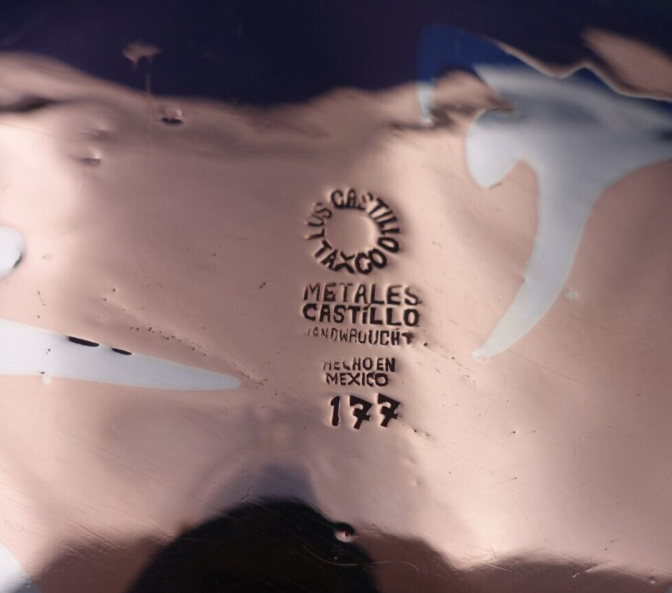 Outstanding Los Castillo Mexican married metals handwrought ashtray featuring people dancing marked #177. This piece measures 8 1/2" x 5 1/4". It is not monogrammed and is in good estate condition. Terrific!