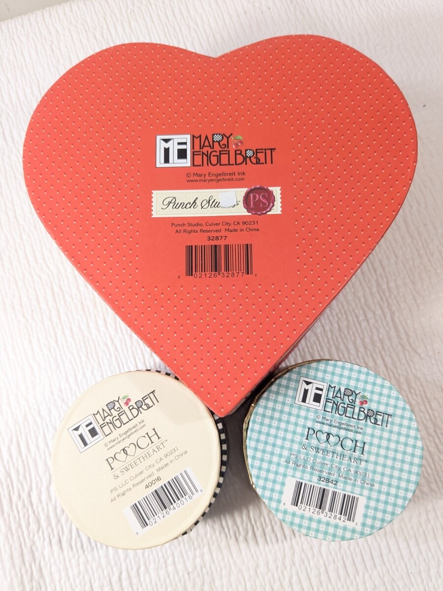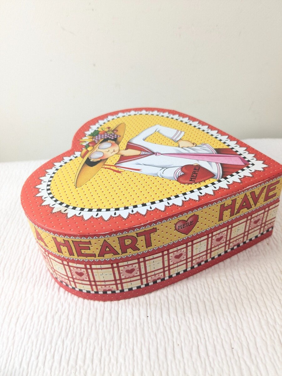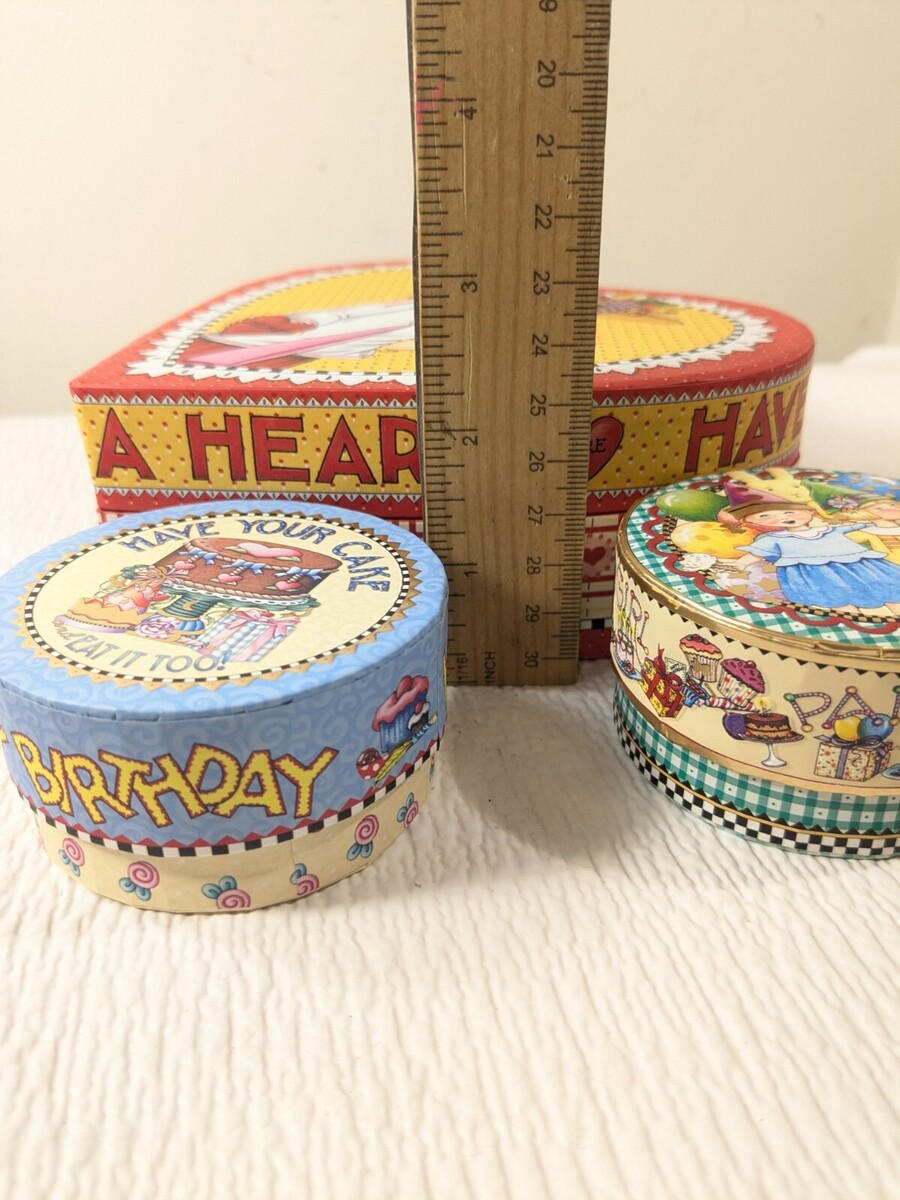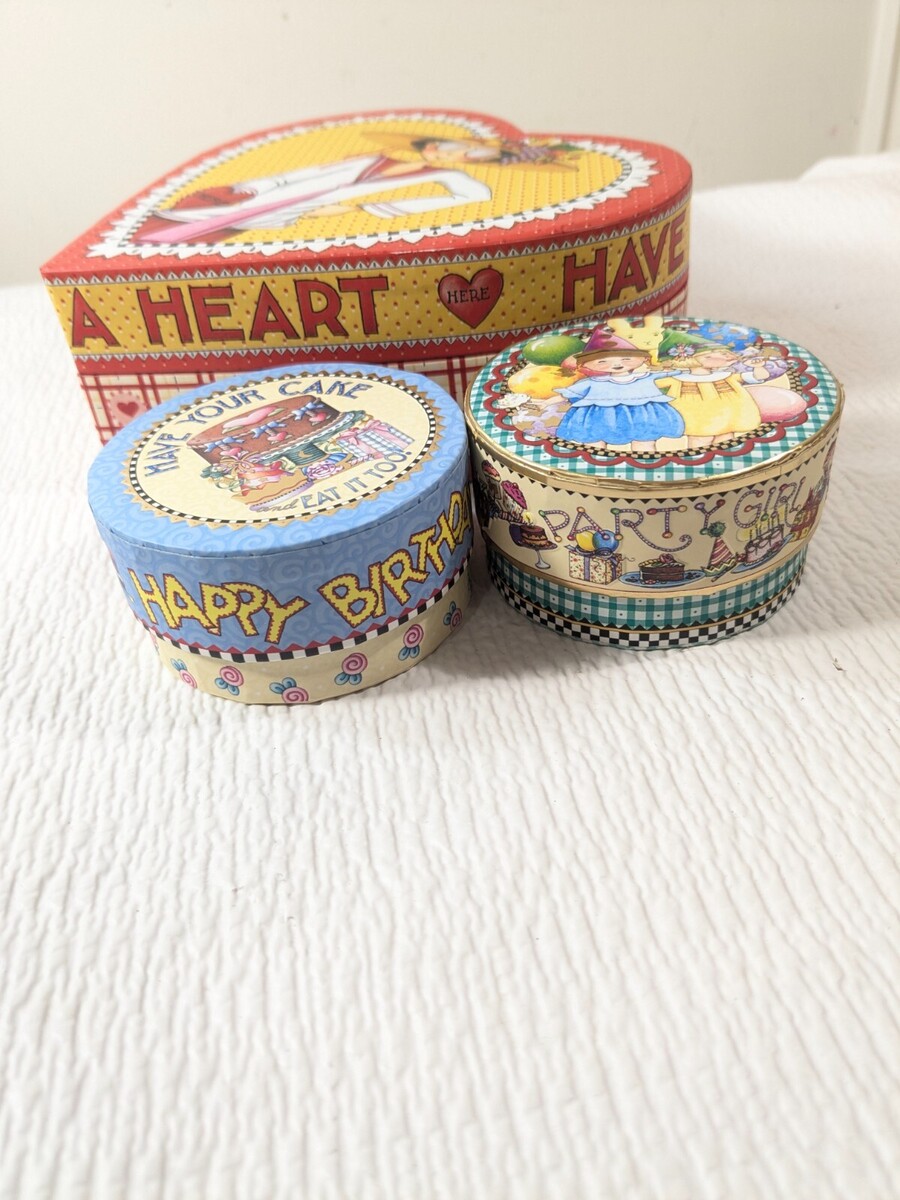 Includes 3 boxes: Heart shaped Have a Heart, small round Have your Cake and eat it too, and Party Girl(Birthday party themes) Heart shaped box has small peeling where the paper joins together, otherwise excellent condition. See pics