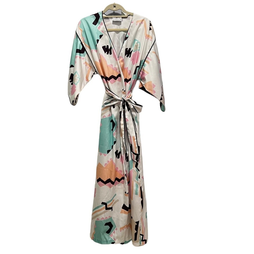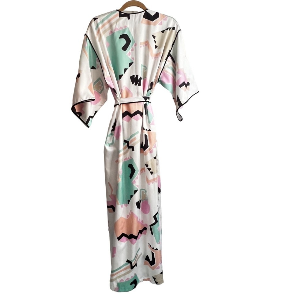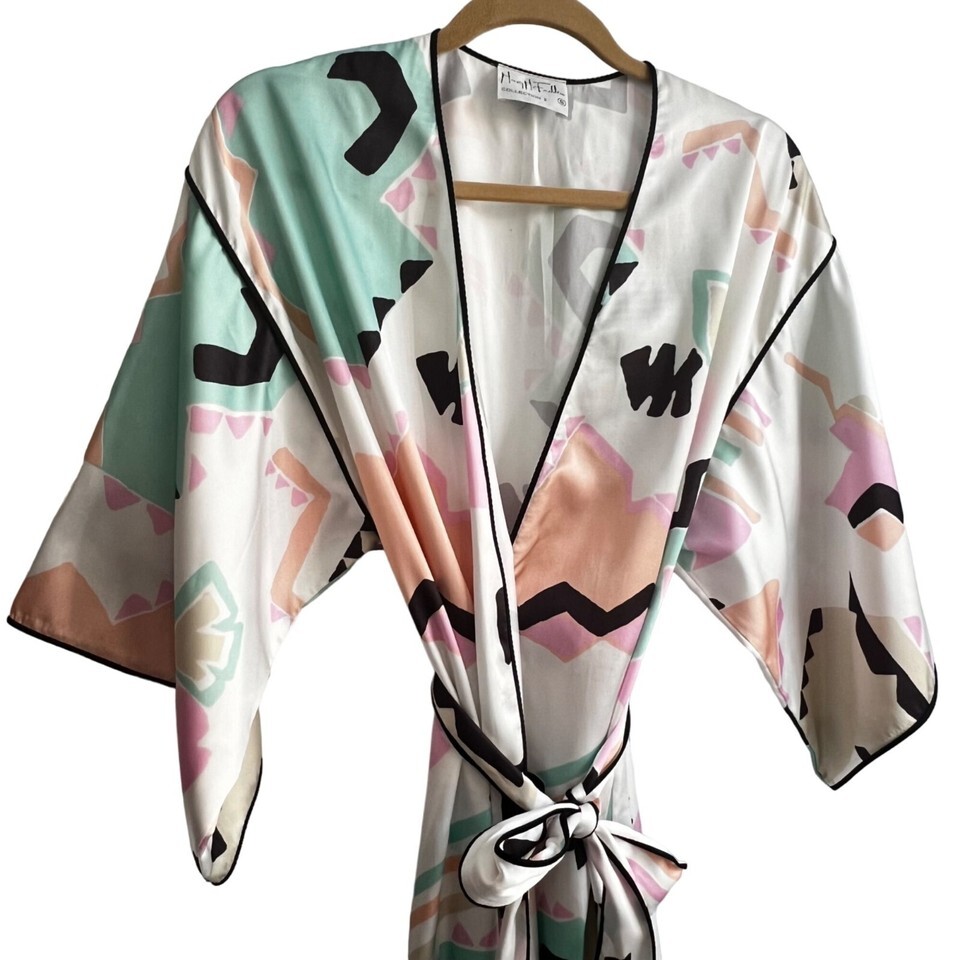 - Mary McFadden Collection I Silky Kimono Robe Geometric Abstract Print Satin S