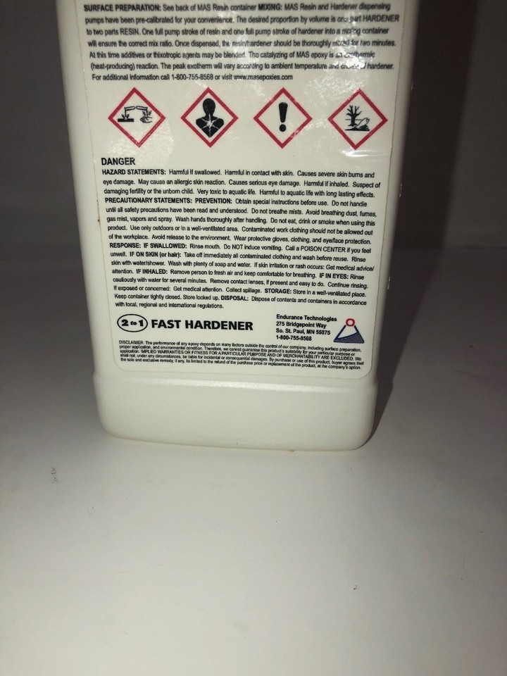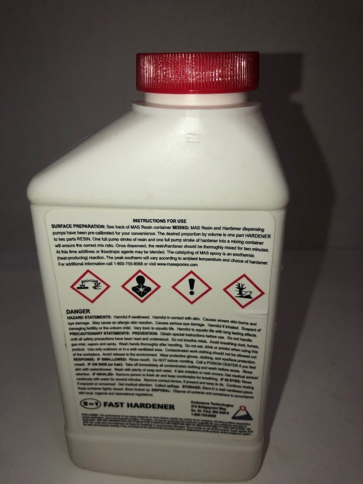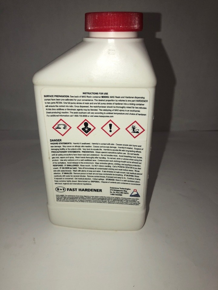 15.98 Onces Large Bottle Mas Fast Epoxy Hardener by Endurance Technologies. Fast Epoxy Hardener. After mixing resin and fast hardener, you have 30 minutes to get it out of the cup and approximately 4 hours of open working at 70F. Good ultraviolet stability. Excellent barrier coating. Cures in high humidity. Recommended for large surface coatings and laminations. Mix with appropriate MAS resins in a 2 parts resin to 1 part hardener ratio.