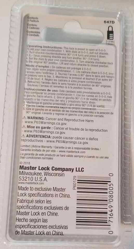 - Master Lock 647D Padlock 1 Black Set & Reset Your Own Combination (LOC PEG-3LP