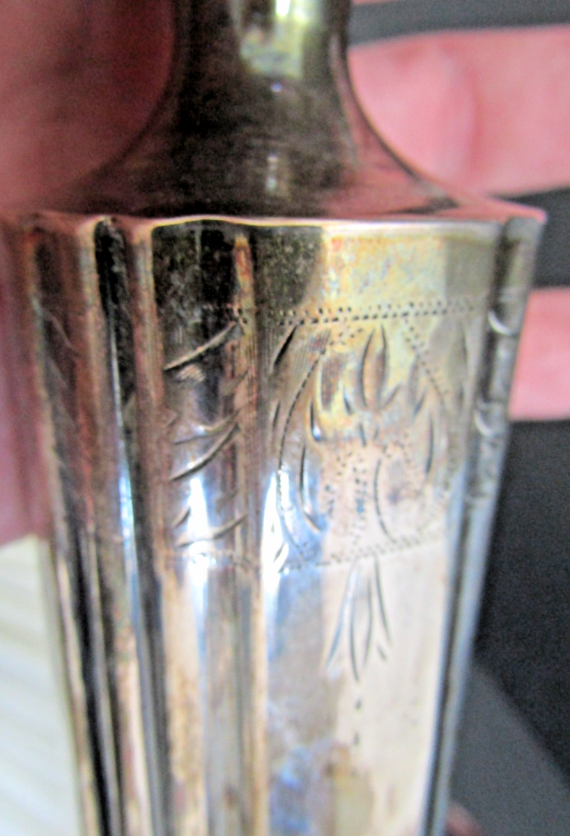 Pair of antique Victorian-style sterling silver candlestick table lamps with shades. The medium-sized lamps feature a corded electric power source and an inline switch for easy control. The lamp bases are intricately engraved and have a bell-shaped shade in a silver color. Made between 1920-1949, these original table lamps are perfect for collectors of vintage lighting and those looking to add a touch of elegance to their living space.