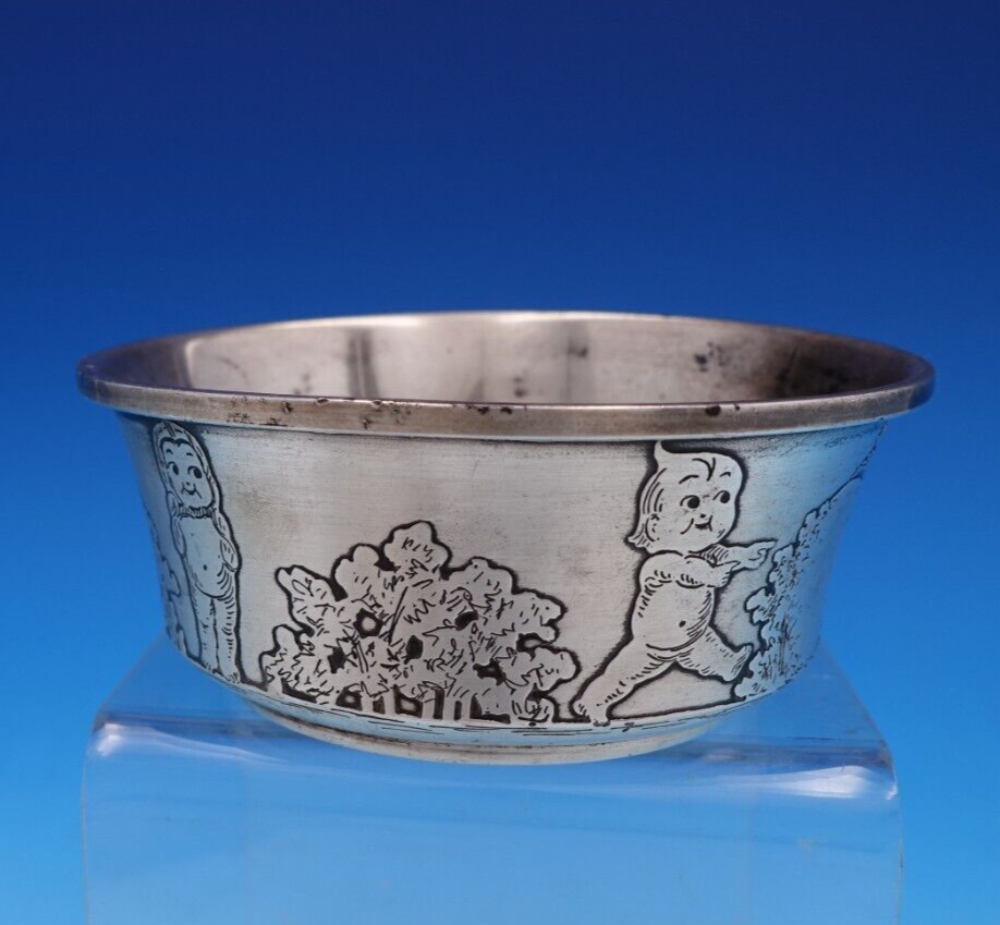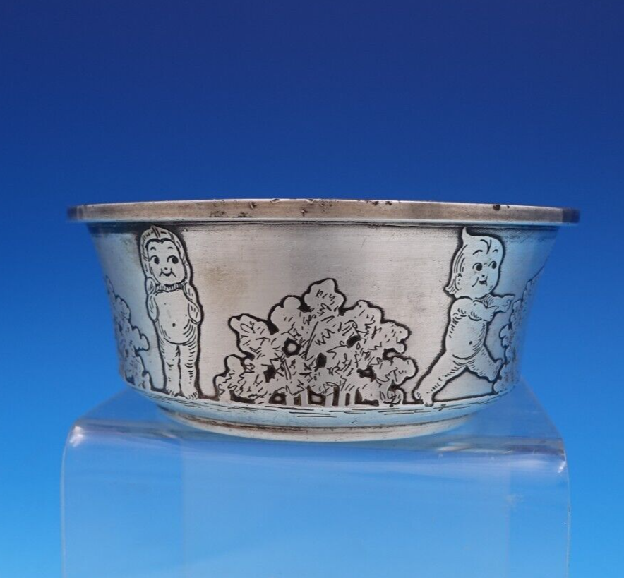 Charming Matthews Co sterling silver acid etched child's bowl featuring Kewpie Dolls and bushes. This bowl measures 1 3/4" tall x 4 1/2" and weighs 3.8 troy ounces. It is not monogrammed and is in good estate condition. Wonderful!