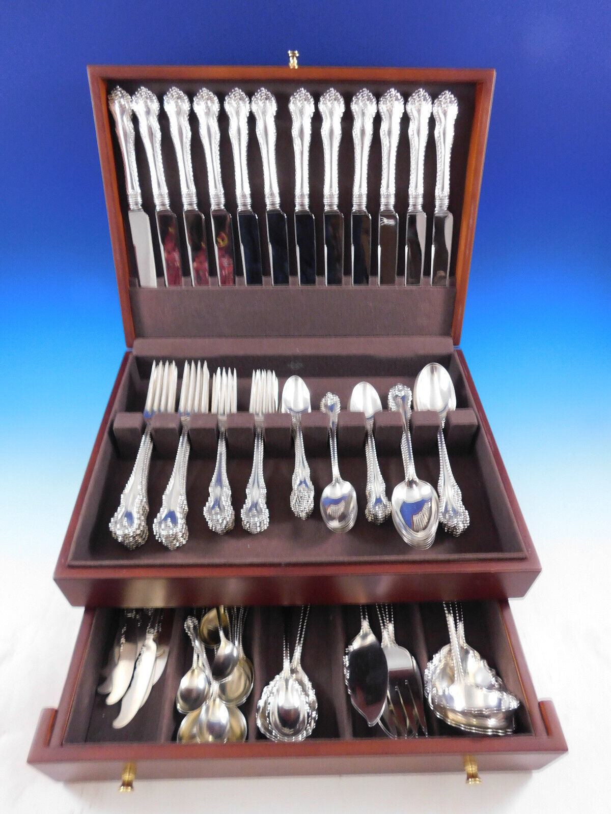 COMPLETE FLATWARE SETHOSTESS HELPERSHOLLOWWARE / TEA SETSMUSEUM QUALITY/FIGURAL SILVERFINE ESTATE VINTAGE JEWELRYMID-CENTURY MODERNSILVER FLATWARE SILVERWAREBuccellatiChristofleGeorg JensenNew Georg Jensen HollowwareNew Georg Jensen JewelryGorhamInternationalLuntMichael Aram - NewReed BartonTiffany Co.TowleWallaceWhitingPLACE SETTINGS