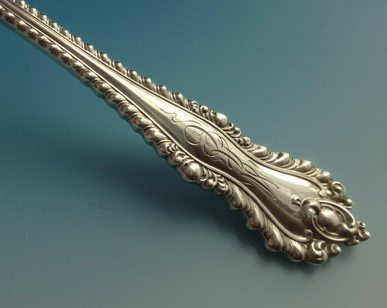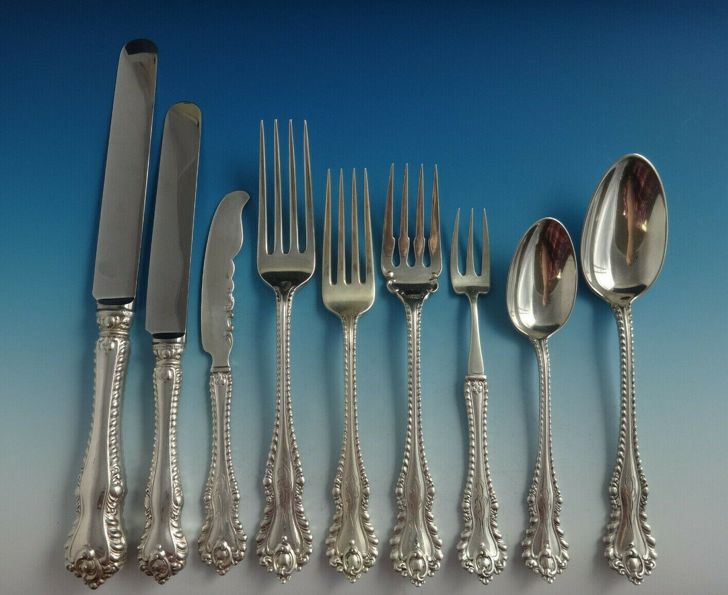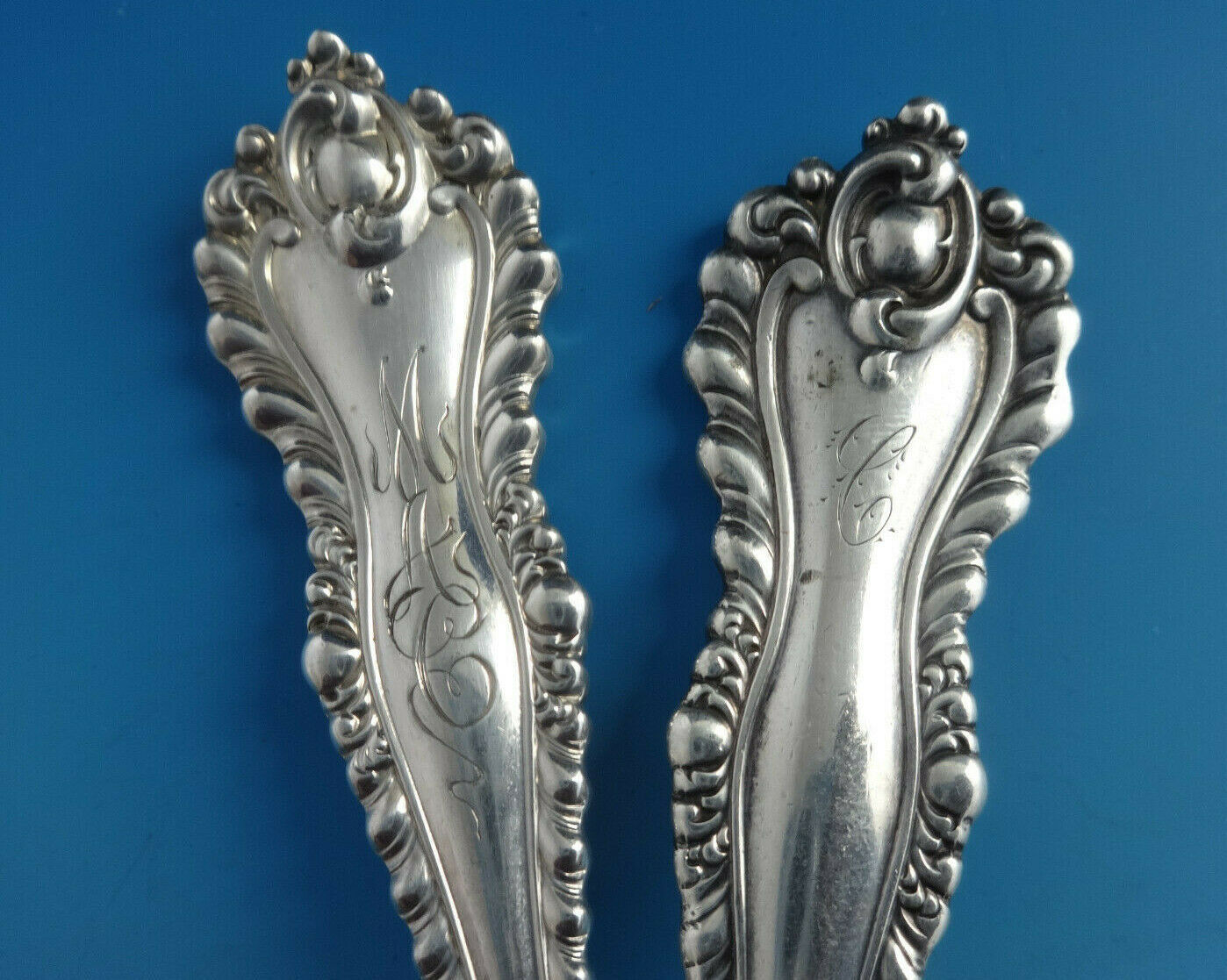 This set will be beautifully professionally polished prior to shipping. The dinner regular knives are not monogrammed, the rest of the pieces all have matching 3-letter fancy monogram except for 1 serving spoon which is monogrammed "S".
