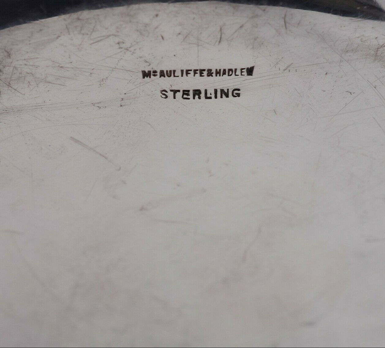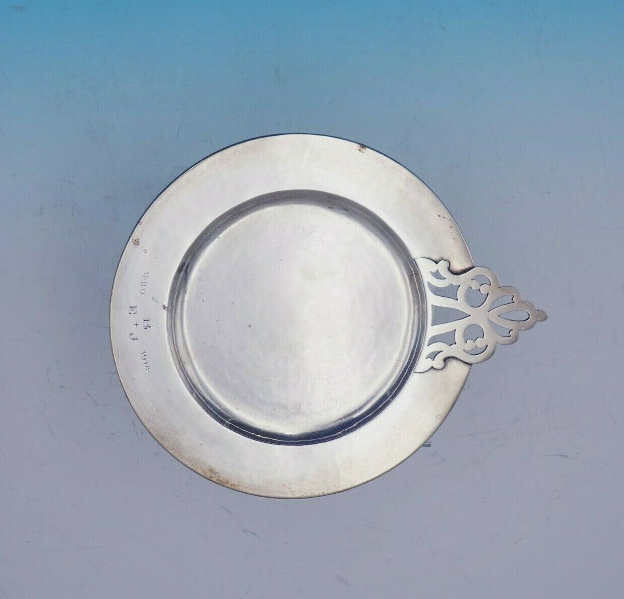 Wonderful McAuliffe and Hadley Arts and Crafts sterling silver plate. This plate measures 7" in diameter (and 8 1/4" with the pierced handle) and weighs 6.73 troy ounces. It has a vintage monogram with the date (see photos) and is in excellent condition. Fantastic!