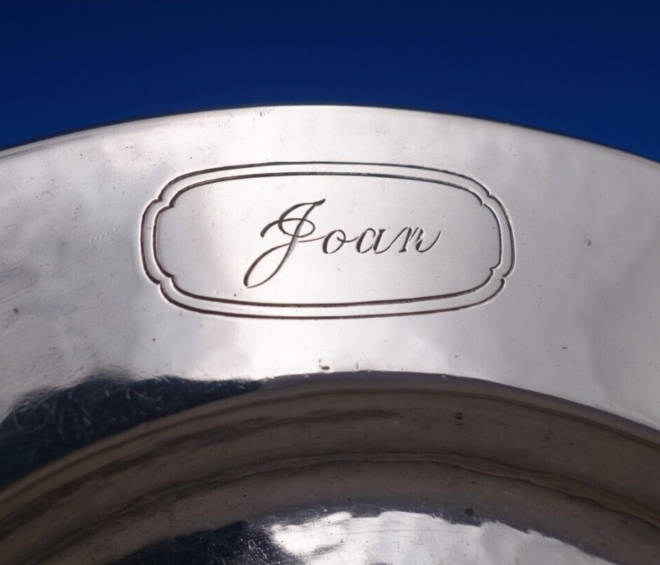 Wonderful McChesney Co sterling silver hand hammered child's plate marked #W19R6. The plate measures 6 1/2" in diameter and weighs 4.95 troy ounces. It is monogrammed "Joan" on the rim (see photos), and is in good estate condition. Terrific!