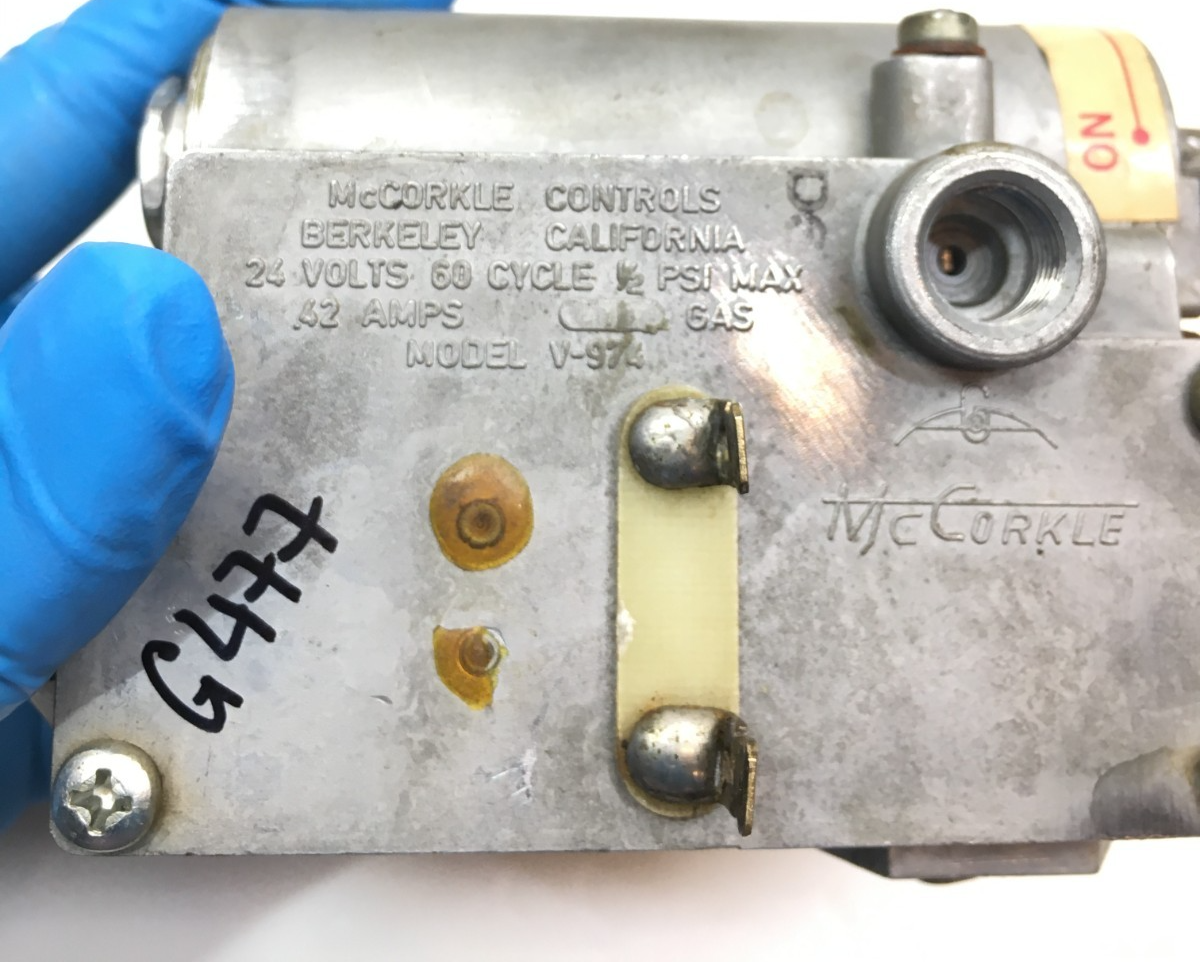 - McCorkle V-974 HVAC Natural Gas Valve in / out 1/2" 24V 60 1/2 PSI Max used G477
