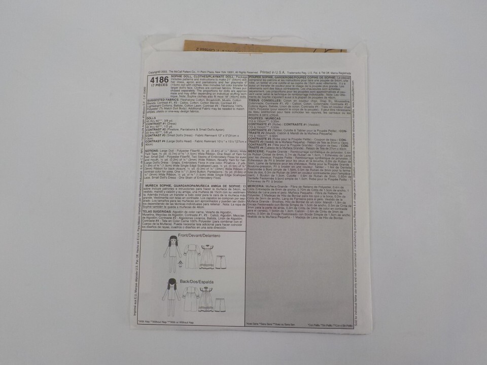 - MCCALLS CRAFTS PATTERN #M4186 SOPHIE RAGTIME DOLL CLOTHES PLAYMATEDOLL UNCUT2003