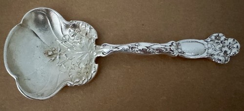 Gorgeous Sterling Silver TWO PIECE FLAT HANDLE ALL STERLING VEGETABLE SERVING SET 9 1/4", with pierced fork, in the pattern MEADOW BY GORHAM. It is monogrammed (MONOS VARY) and is in excellent condition.