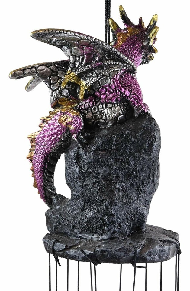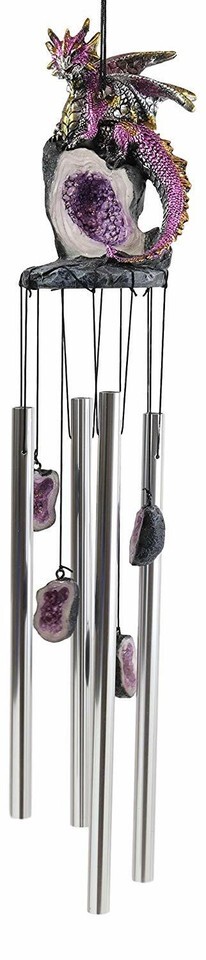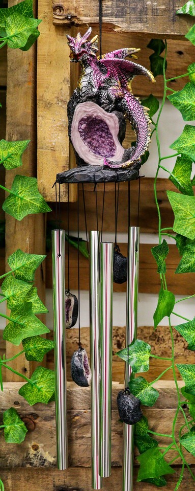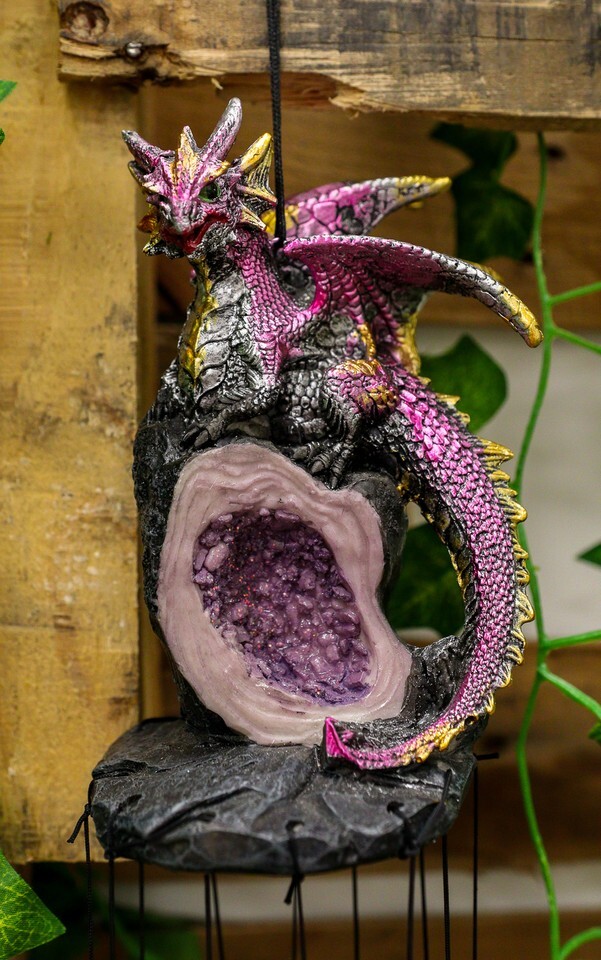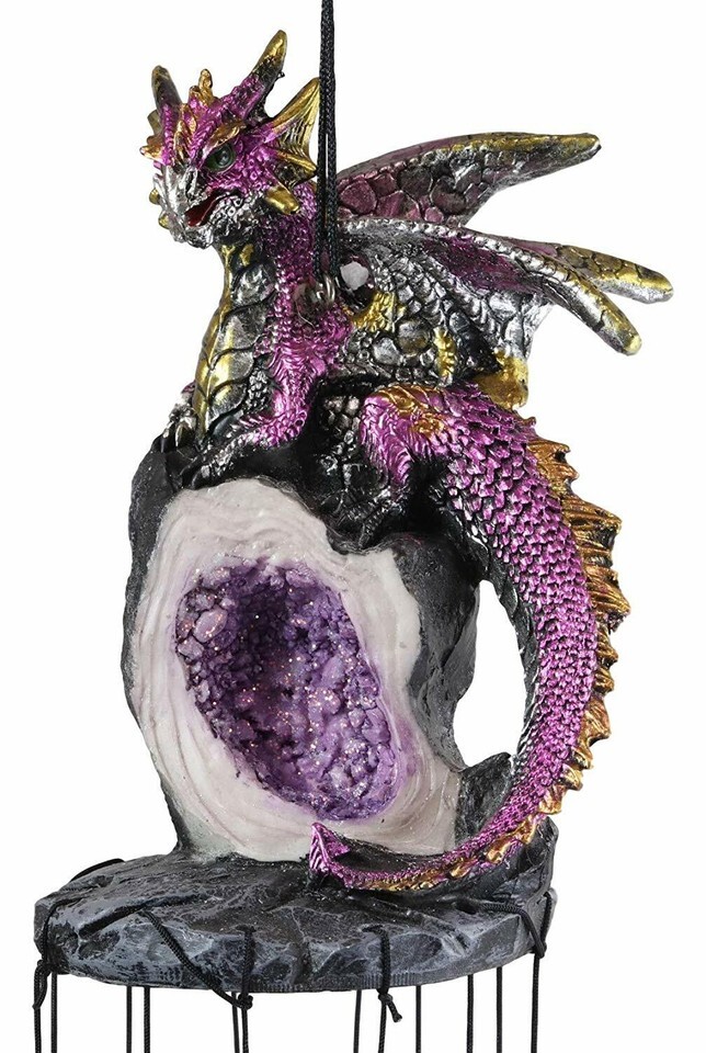 - Medieval Purple Dragon Guarding Topaz Crystal Geode Rock Figurine Wind Chime