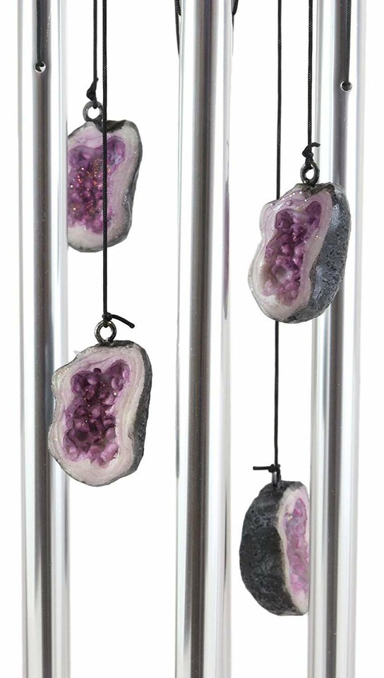 ? A purple topaz metallic guardian dragon perches on top of a geode crystal rock of immeasurable power and magic. Connected to the sculptural crown of the wind chime are aluminum rods and ornamental sculptures of miniature geode rocks. The wind chime is a perfect gift for your loved ones who love dungeons and dragons, myths and magic, gothic alchemy themed decors.