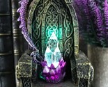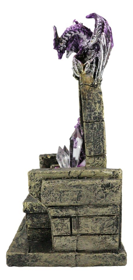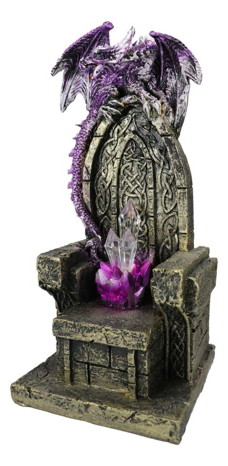? This purple dragon protector of the king on throne figurine is our latest release in our dragon fantasy collection. Gripping onto the top of his 'Stone' Throne, the purple metallic dragon has landed! The dragon stands on guard protecting the crystals placed upon the throne. The light up LED crystals will alternate in colors when switched on.