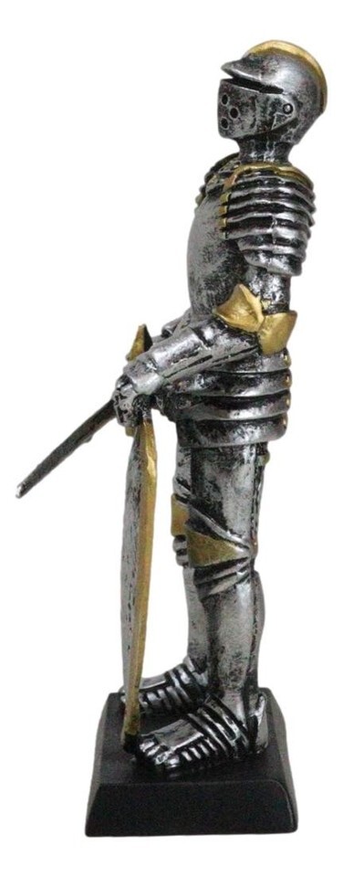 ? A royal knight is arraigned in silver and gold, wearing a heavy battle armor suit and carrying a sword and spade shield in his hands. He is of the elite order of the chivalrous knight, putting his life on the line to defend his King and Country.