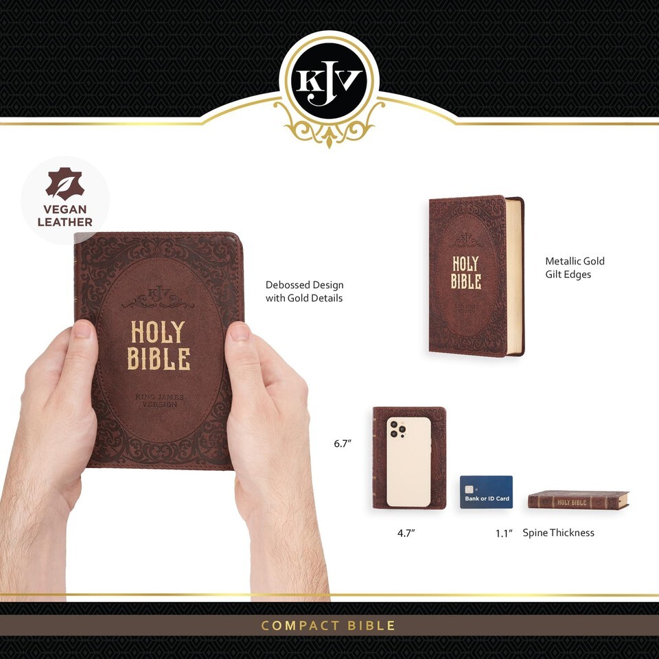 The Medium Brown Faux Leather Compact King James Version Bible features the Classic King James text packaged in a highly portable Bible format.