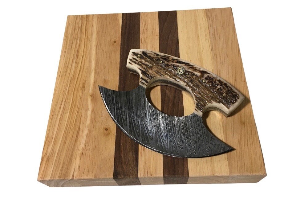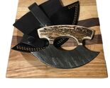 Medium Stag Handle Wood Handle Ulu Knife 5" Damascus Blade Bowl Leather Sheath