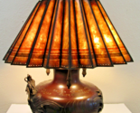 - Meiji Period Bronze Dragon Relief Table Lamp and Restored Mica Pleated Lampshade
