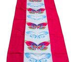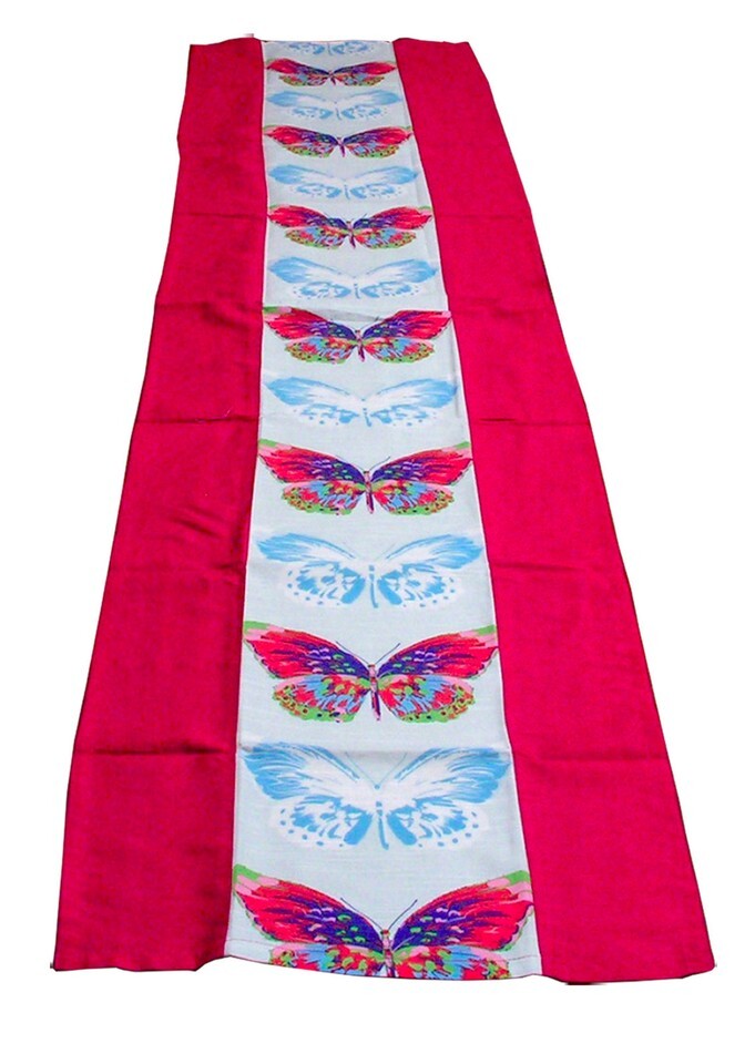 Beautiful and bright. Butterfly, Wings of Color, Table Runner. 13X72 inches 100% polyester. Eye-catching colors printed with a strip of vibrant butterflies and their negatives alternating down the center with purple, fuchsia, sides. Please note that the position of the butterflies on each runner may vary slightly due to manufacturing differences.