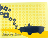 Front has bright yellow background with deeper yellow geometric flowers. A girl with flowing hair drives a mustang convertible down the road with flowers coming out the exhaust pipe. Graphic is in black with a vinyl look. Has the words Memory Lane on the front cover.