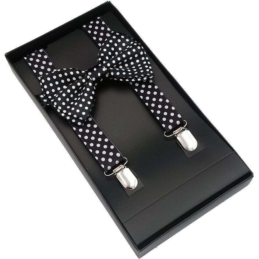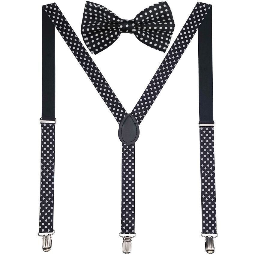 Add a touch of sophistication to your outfit with these white dots suspenders and matching polyester bowtie. Designed for men, the elastic band ensures a comfortable fit while the clip attachment type securely fastens to your pants. The suspenders are made of high-quality polyester material and come in one size, making them suitable for most individuals. Perfect for formal occasions or adding flair to your everyday look, these suspenders and bowtie are a stylish addition to any wardrobe.